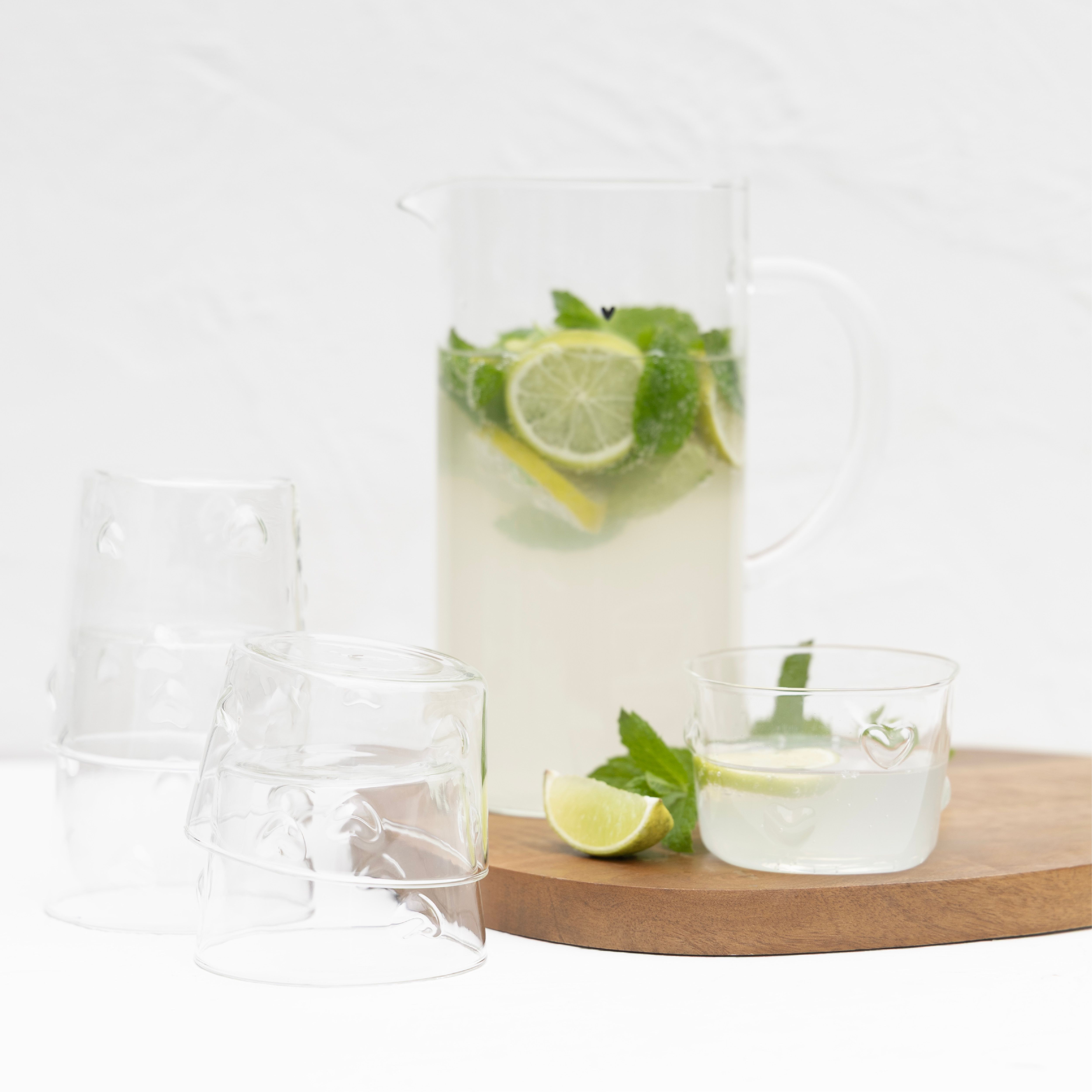 Ob für frisches Wasser mit Minze, selbstgemachte Limonade oder als stilvolle Saftkaraffe beim Brunch – dieser Krug aus hochwertigem Borosilikatglas macht überall eine gute Figur. Das Glas ist besonders leicht, stabil und geschmacksneutral. Das kleine, handgezeichnete schwarze Herz auf der Vorderseite setzt einen charmanten Akzent, der Gemütlichkeit und Stil perfekt vereint.