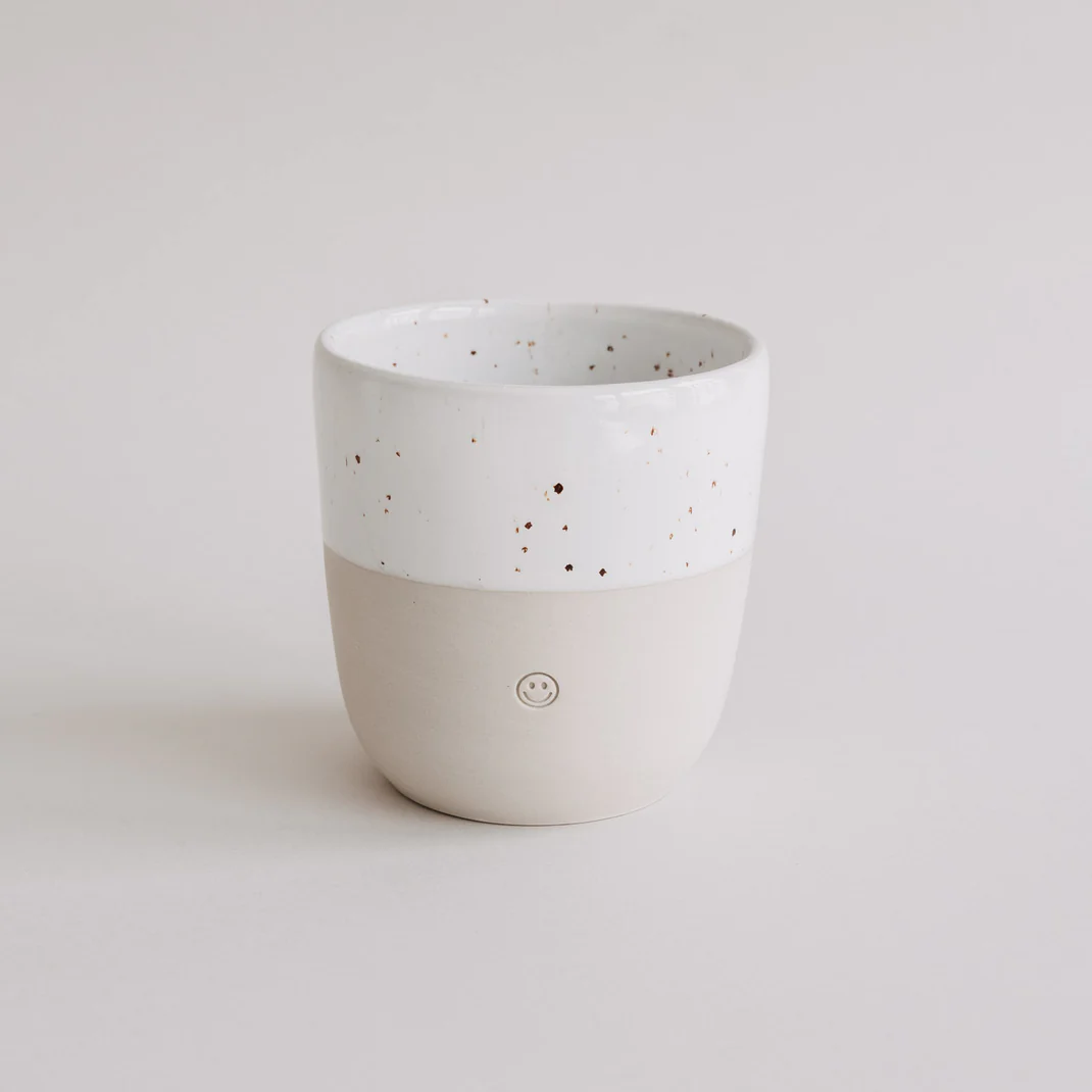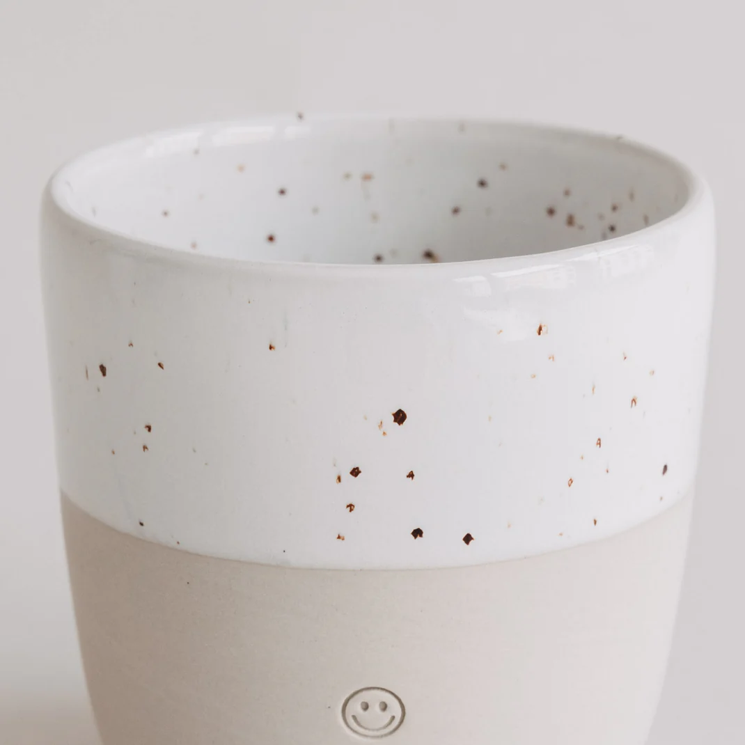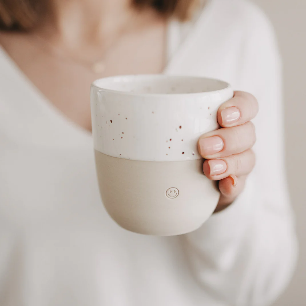 Starten Sie mit einem Lächeln in den Tag! Der Eulenschnitt Steingut-Becher „Smiley“ ist der ultimative Gute-Laune-Garant für Ihren Frühstückstisch. Jeder Becher wird in aufwendiger Handarbeit gefertigt, was ihm eine ganz persönliche Note verleiht. Das eingeprägte Smiley-Relief auf der Vorderseite sorgt nicht nur optisch für Freude, sondern fühlt sich beim Halten auch wunderbar hochwertig an.