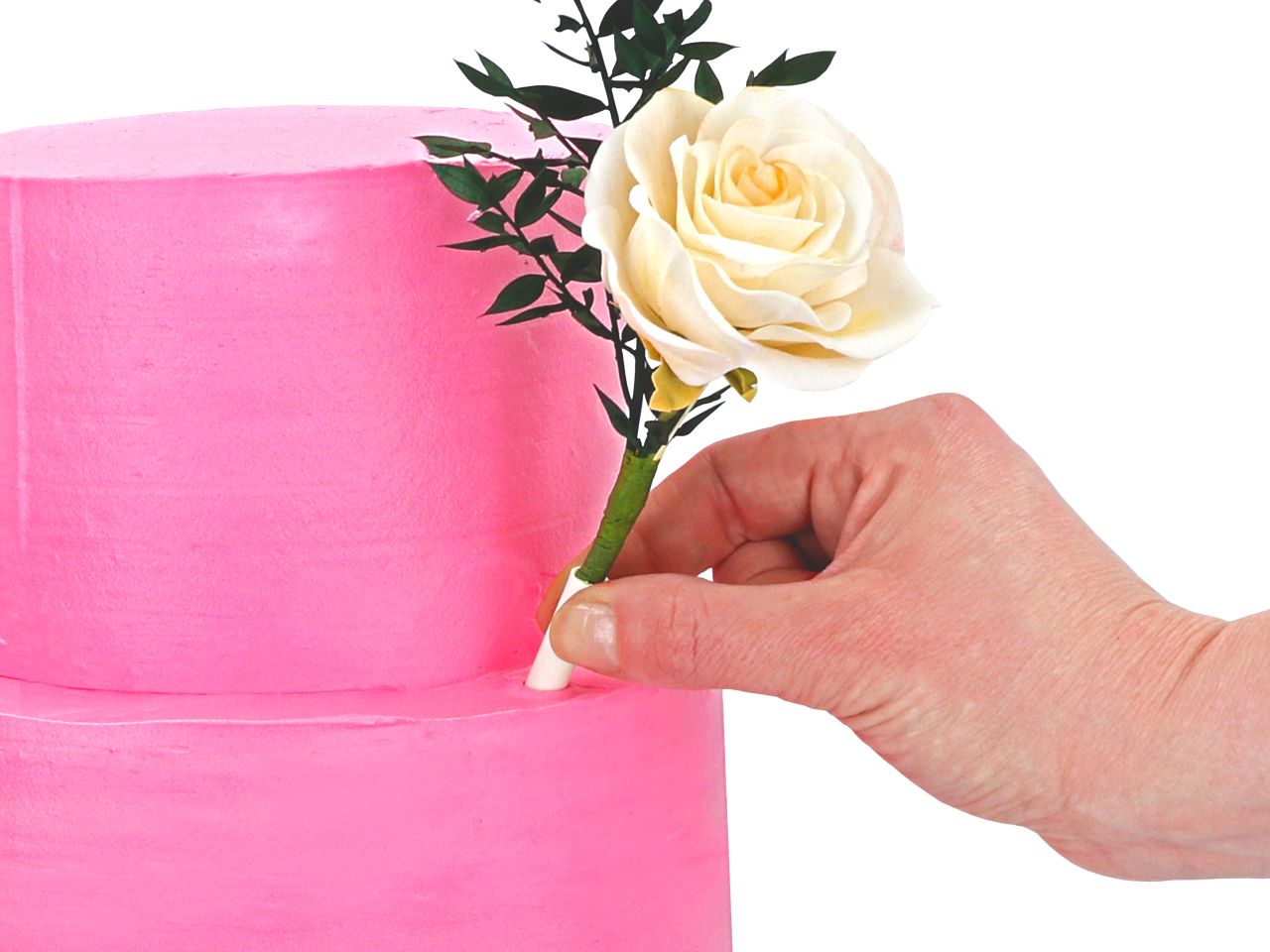 Anwendung: Um echte Blumen und Blüten frisch zu halten, können Sie etwas Wasser in die Halter füllen. Stecken Sie die Blumenhalter dann senkrecht in Ihren fertigen Torten oder Kuchen und stellen Ihre Blumenstiele oder die Drähte dort hinein.