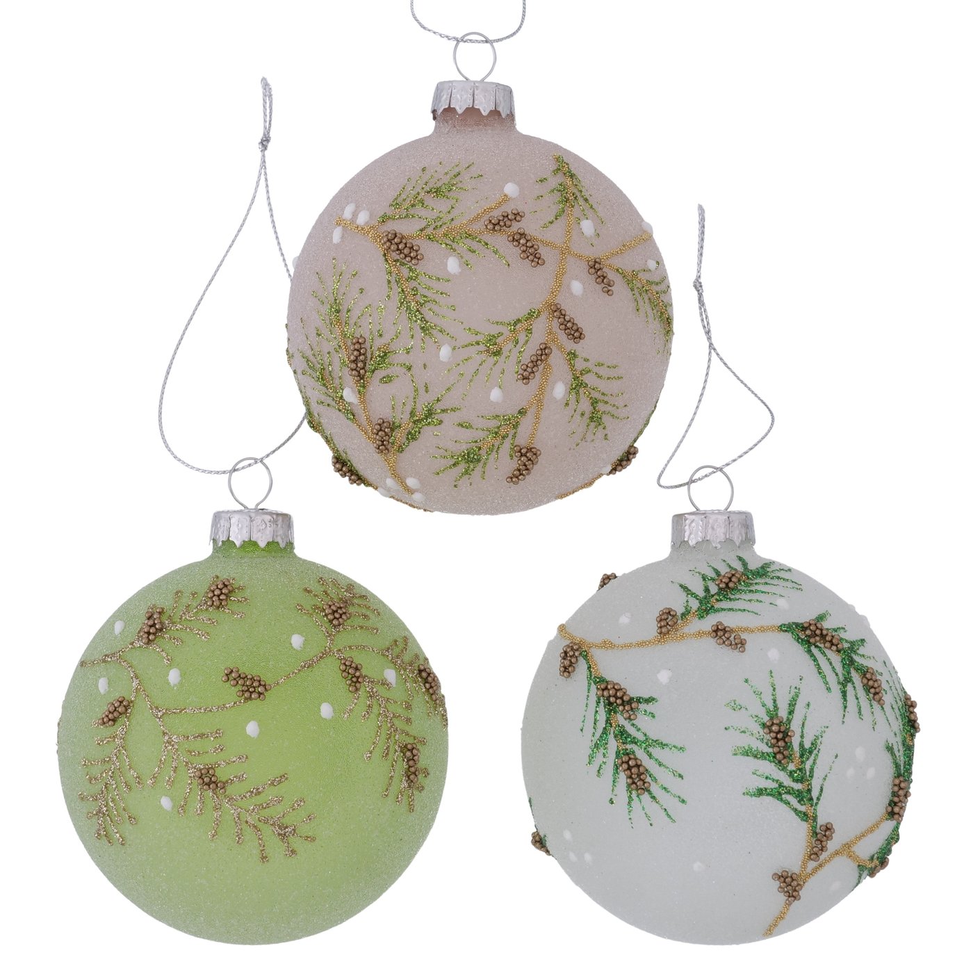Die Weihnachtskugel „Mikos“ verbindet handwerkliche Kunst mit natürlicher Eleganz. Gefertigt aus handbemaltem, lackiertem Glas und Aluminium, begeistert sie mit einem mehrfarbigen Design in Beige, Grün und Weiß. Die Kombination aus matten und glitzernden Oberflächen verleiht der Kugel eine edle, festliche Ausstrahlung.