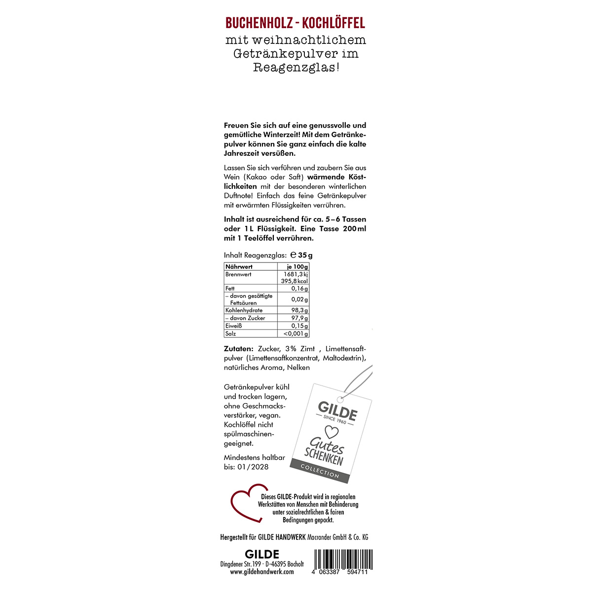 Ein liebevolles Geschenk für die kalte Jahreszeit! Der Buchenholz-Kochlöffel mit weihnachtlichem Getränkepulver im Reagenzglas ist eine charmante Geschenkidee für alle Glühweinliebhaber und Genießer winterlicher Aromen.
