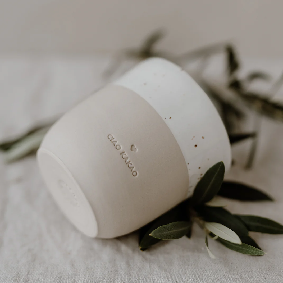 Besonders charmant ist die handgestempelte Blindprägung "CIAO KAKAO", die jeden Becher zu einem Unikat macht. Die Kombination aus der reaktiven Glasur und der matten Unterseite verleiht dem Steingut eine besondere Haptik und eine rustikale, edle Optik. Ob für Sie selbst oder als humorvolles Geschenk für Freunde und Kollegen – dieser Becher bringt eine Prise "Konfetti für die Seele" in den Alltag.