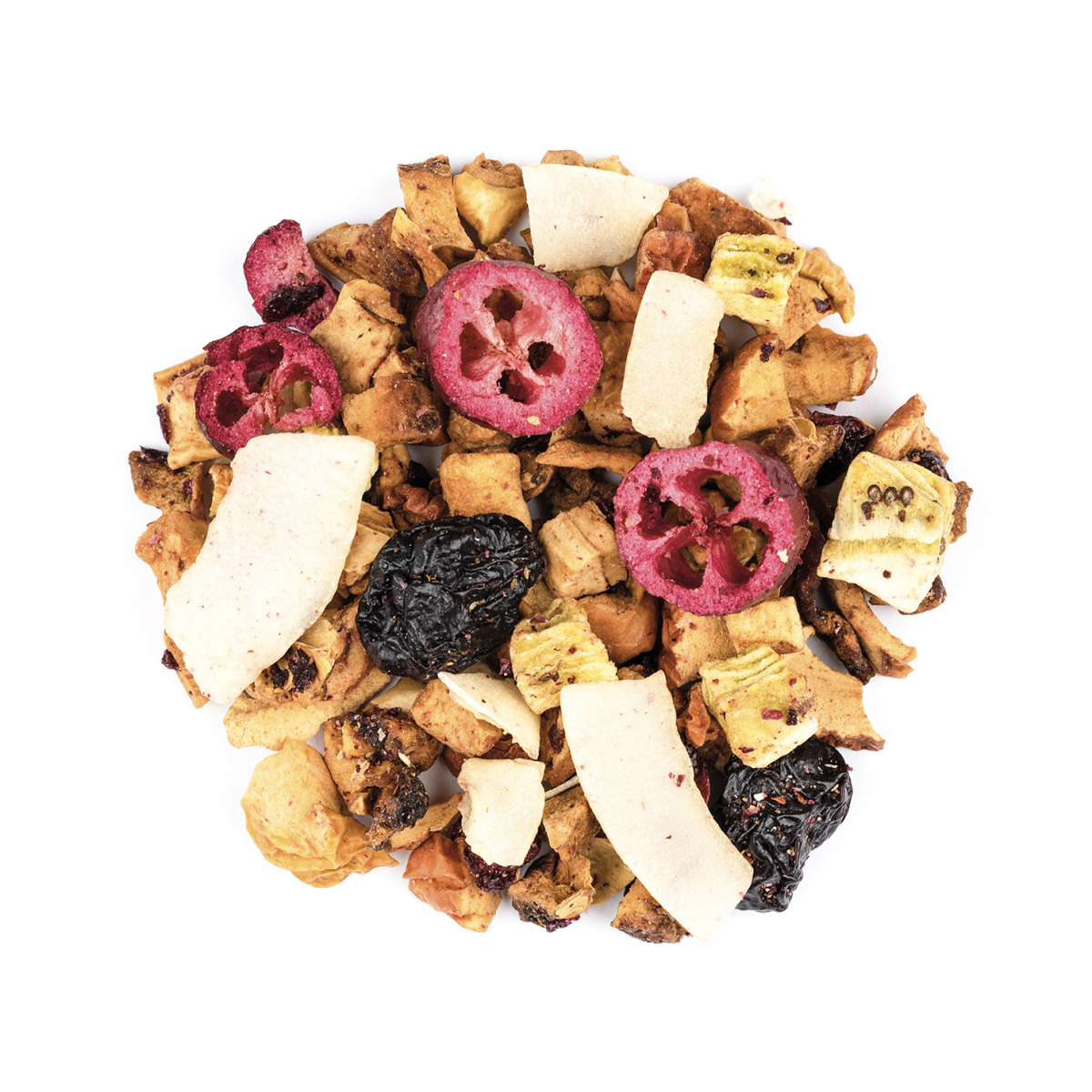 Zutaten: Apfelstücke, Hibiskusblüten, Hagebuttenschalen, Aroma, Zuckerherzen (Zucker, Reismehl, gehärtetes Erdnussöl, Kartoffelstärke, Farbstoff E120, E160a), Erdbeerstücke, Himbeeren.