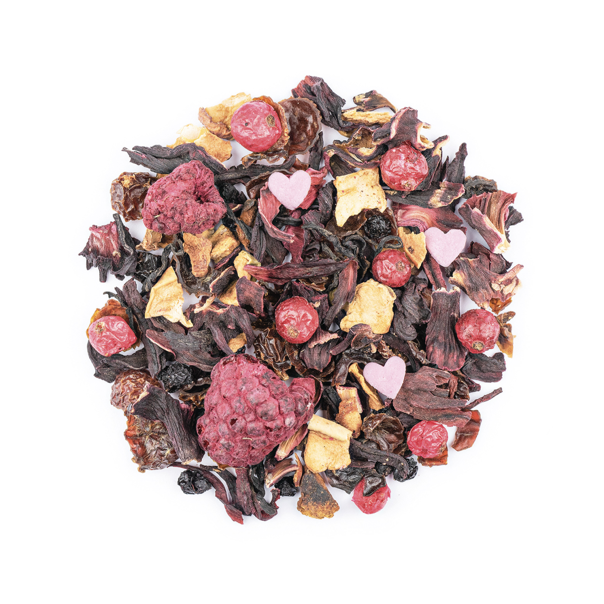 Zutaten: Apfelstücke, Hibiskusblüten, Hagebuttenschalen, Aroma, Zuckerherzen (Zucker, Reismehl, gehärtetes Erdnussöl, Kartoffelstärke, Farbstoff E120, E160a), Erdbeerstücke, Himbeeren.