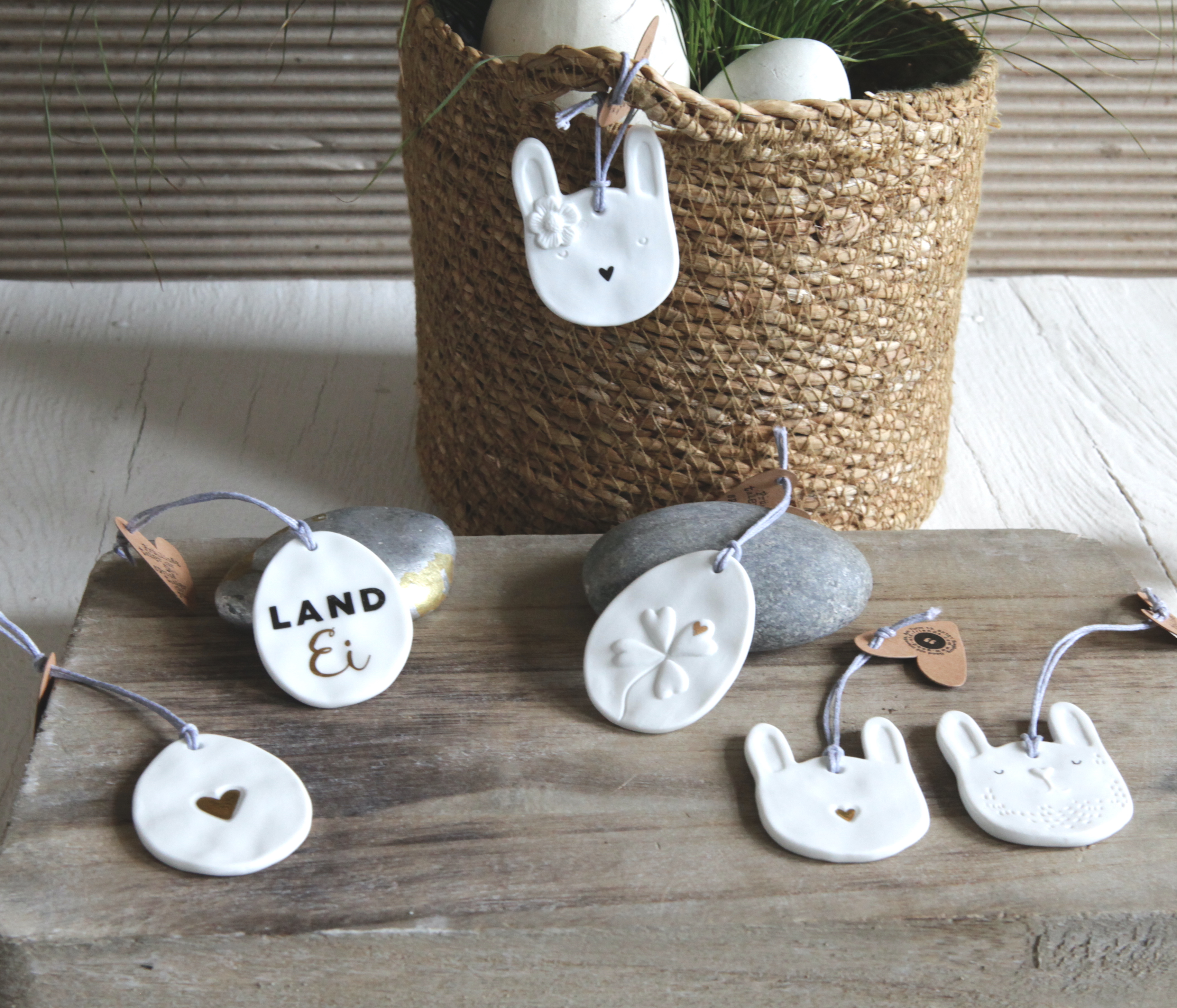 Jeder Anhänger kombiniert ein haptisches Relief mit zarten Decals (Druckmotiven), die typisch für den poetischen Stil von Good old friends sind. Sie eignen sich hervorragend als zauberhafter Schmuck für den Osterstrauch, als edles Detail an einem liebevoll verpackten Geschenk oder als kleine Aufmerksamkeit für einen besonderen Menschen. Ein zeitloser Frühlingsschmuck, der durch seine schlichte Eleganz und hochwertige Haptik das Herz erfreut.