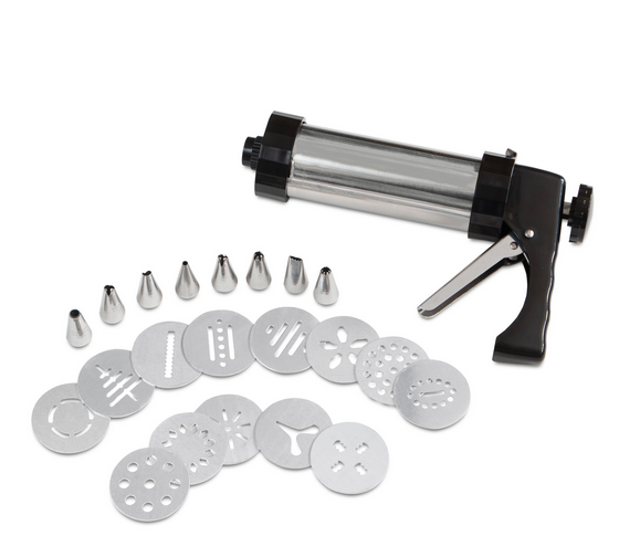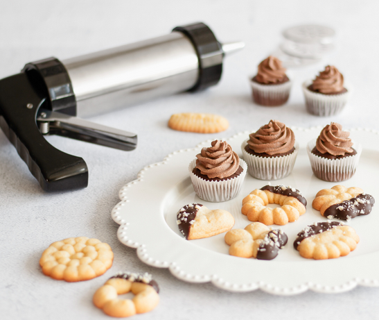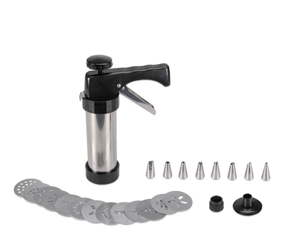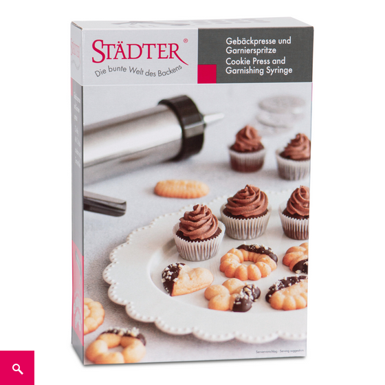Mit diesem Multitalent bleiben keine Wünsche offen. Ganz einfach und schnell zaubern sie leckeres Spritzgebäck in bis zu 13 verschiedenen Motiven. Zudem können sie mit den 8 kleinen Garniertüllen Cupcakes und Torten mit Icing, Frosting oder Buttercreme verzieren.