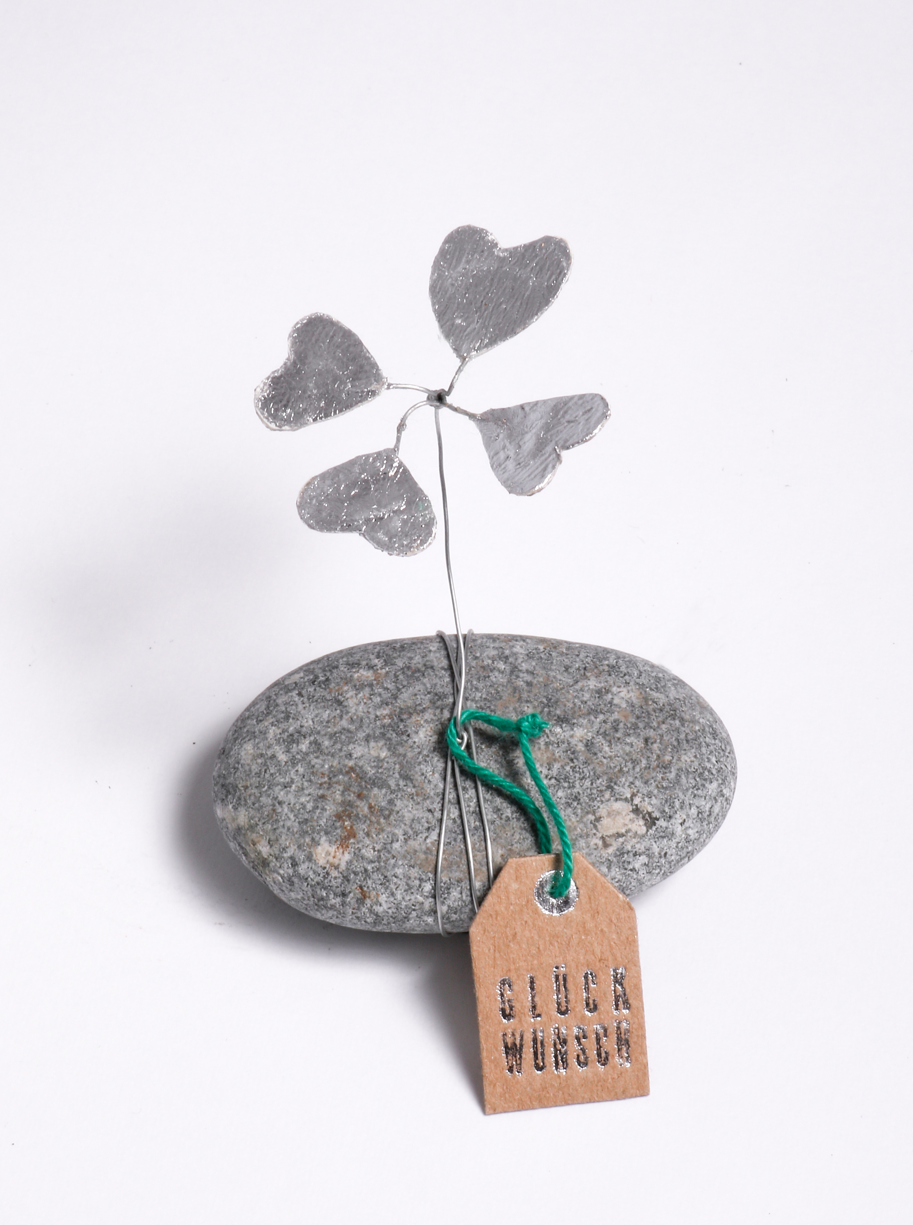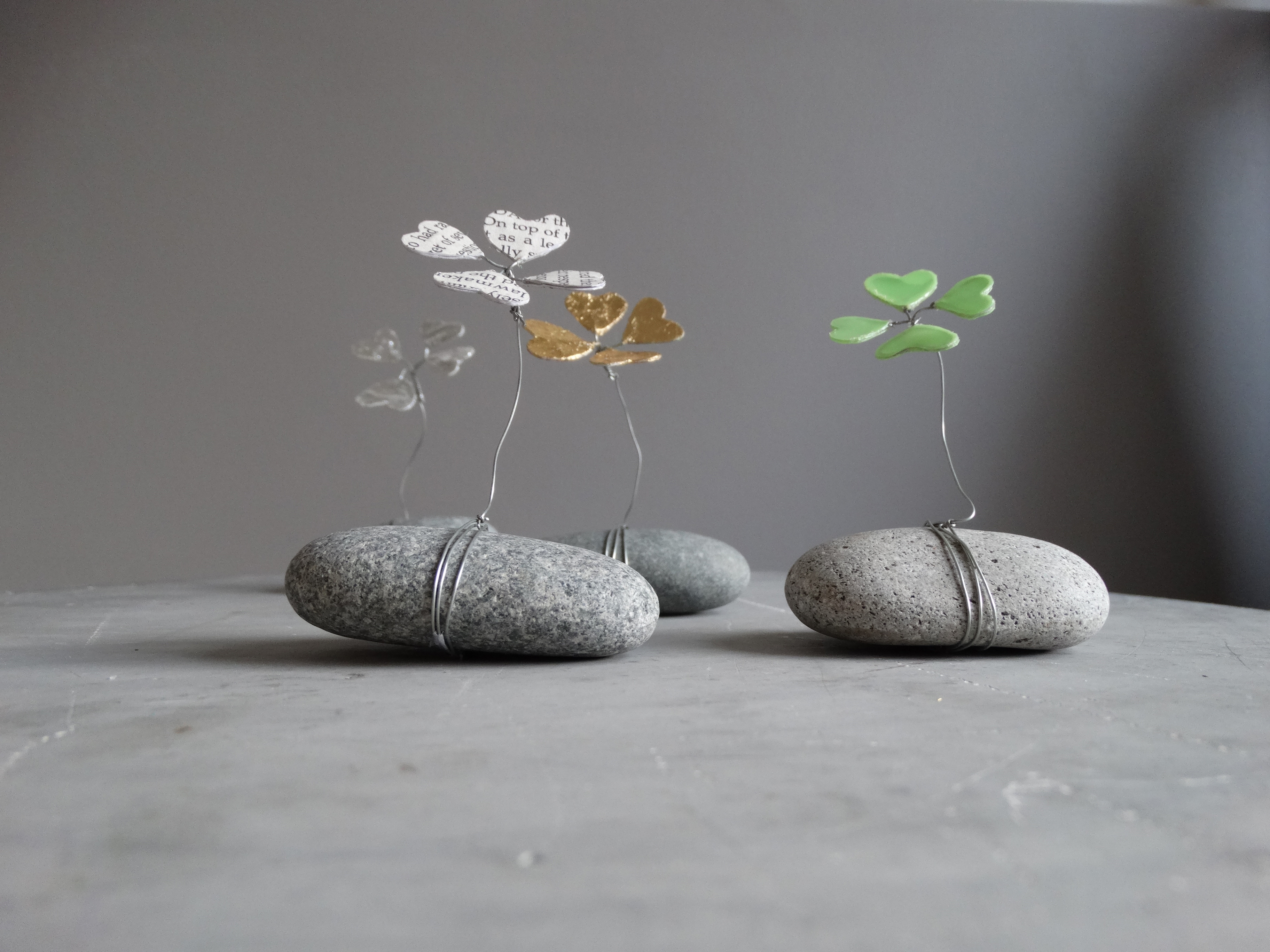 Hier wächst das Glück! Auf echten Steinen wächst hier der vierblättrige Klee aus handgebogenem Draht und Papier und lässt das Glück auf Tisch und Tafel wachsen.