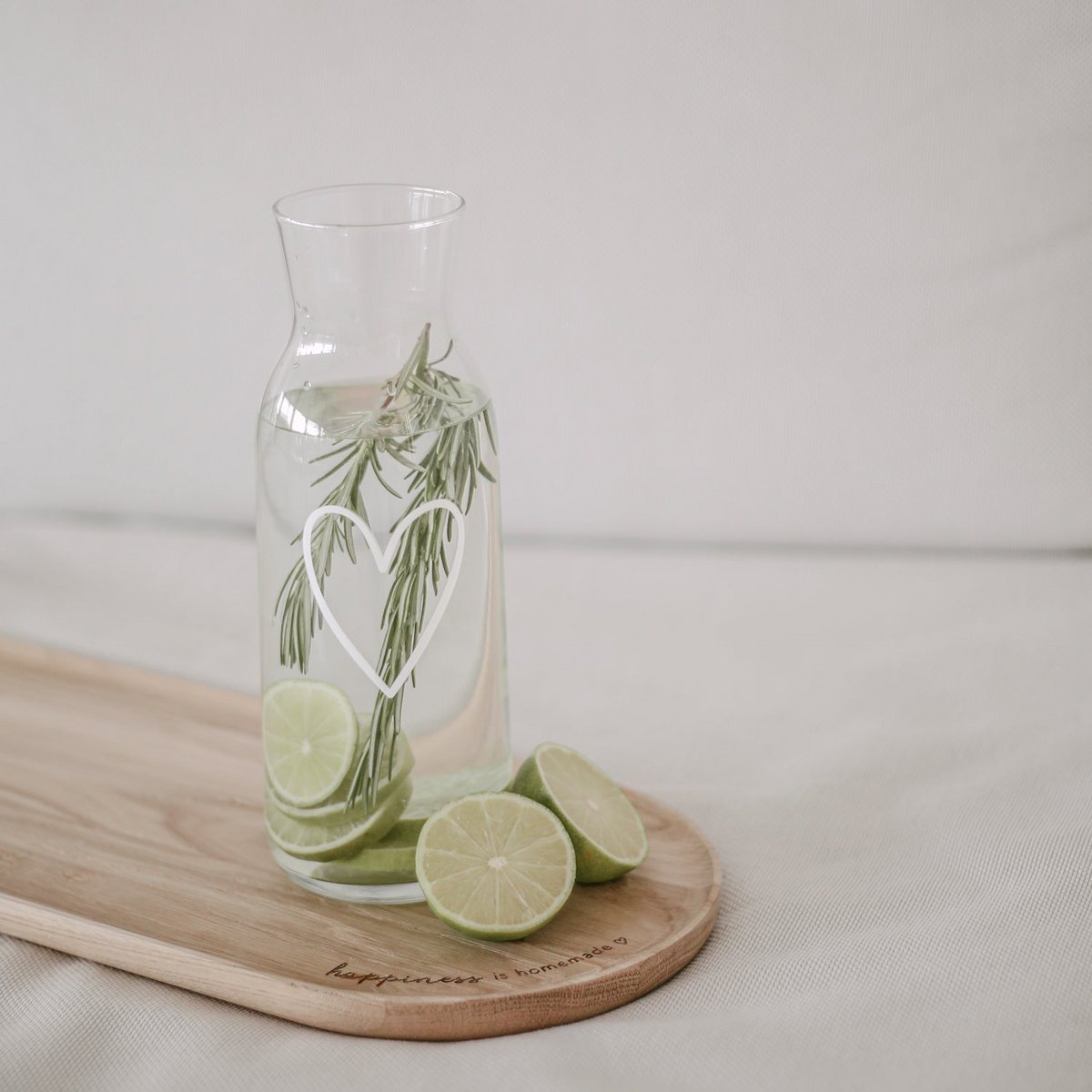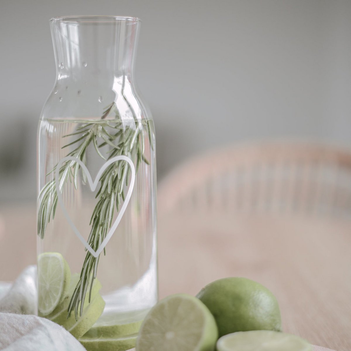 Entdecke unsere wundervolle Karaffe mit weißem Design an der Glaswand. So schmeckt das Wasser, die selbstgemachte Zintronen-Limonade, der frisch gepresste Saft, der Wein oder vieles mehr doch gleich noch viel besser. Diese Karaffe ziert ein wundervolles Herz und macht den Wasserkrug zu einem ganz besonderer Hingucker auf deinem Frühstücks- oder Abendtisch! Mit dem weißen Print passt die Karaffe perfekt zu unseren hohen Trinkgläsern.