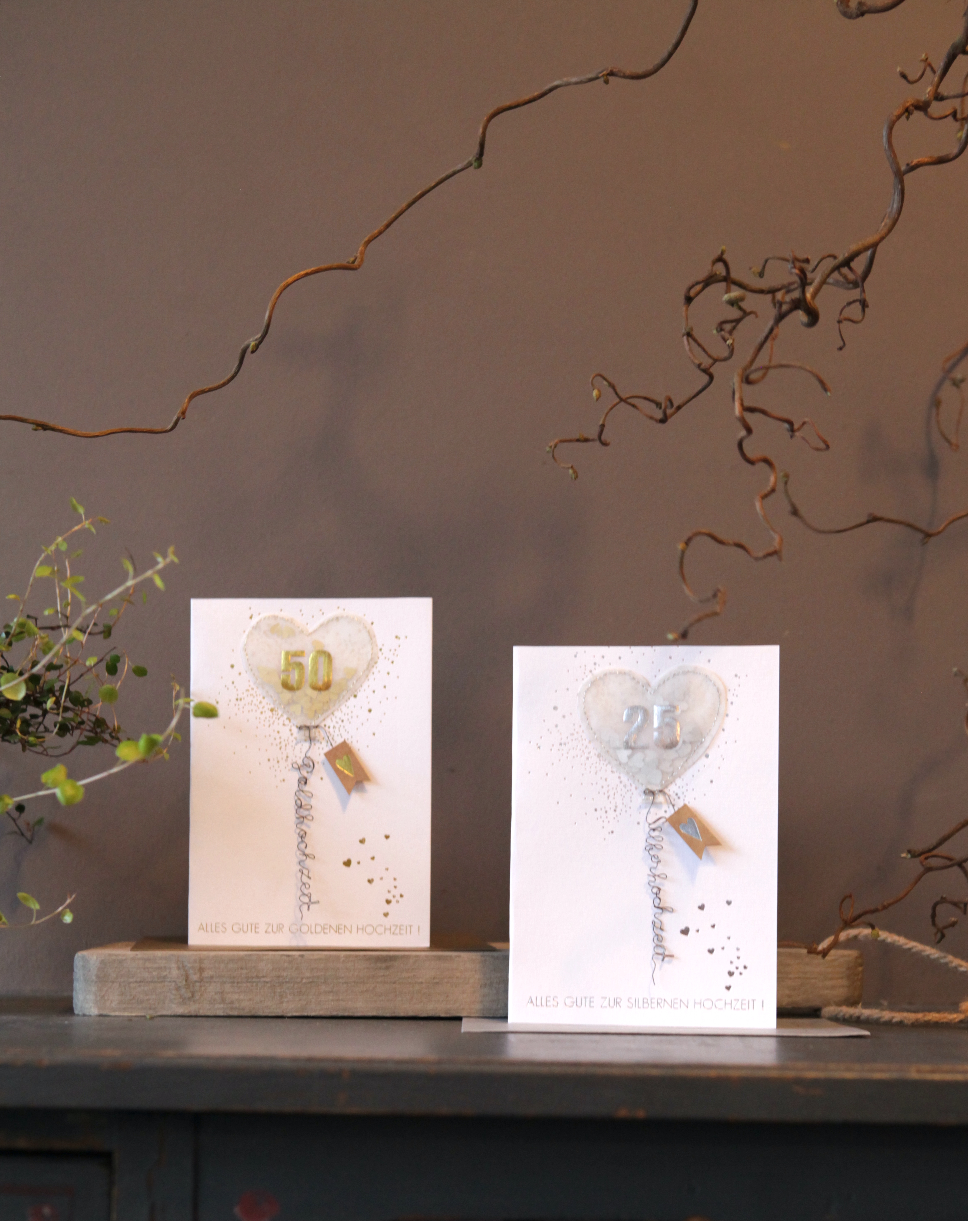 Ein Luftballon voller Konfetti mit kunstvoll gebogener Drahtschrift. Eine Karte voller kunstfertiger Handarbeit und Freude.