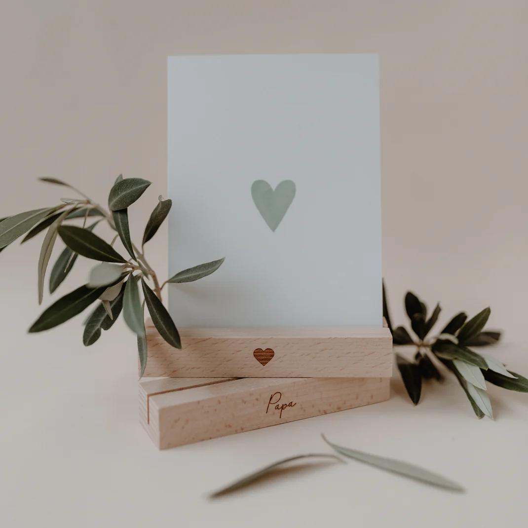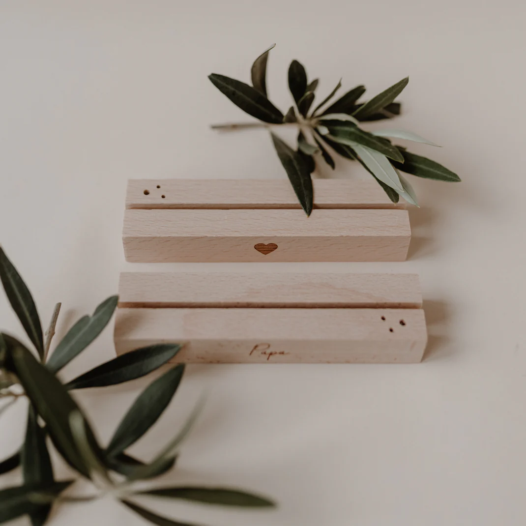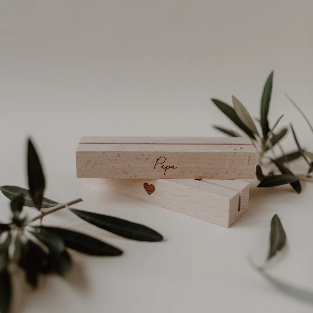 Jeder Ständer verfügt über eine präzise gefräste Spalte für Karten sowie drei kleine Löcher, die Platz für Trockenblumen bieten. So lässt sich im Handumdrehen eine individuelle Dekoration kreieren. Die Vorderseite ist mit einer edlen Lasergravur veredelt: Ein Ständer trägt den schlichten Schriftzug „Papa“, der andere ein minimalistisches Herz. Dank der kompakten Länge von 12 cm passen sie perfekt auf den Schreibtisch, das Sideboard oder den Nachttisch. Ein zeitloses Design-Objekt, das zeigt: Papa ist der Beste!