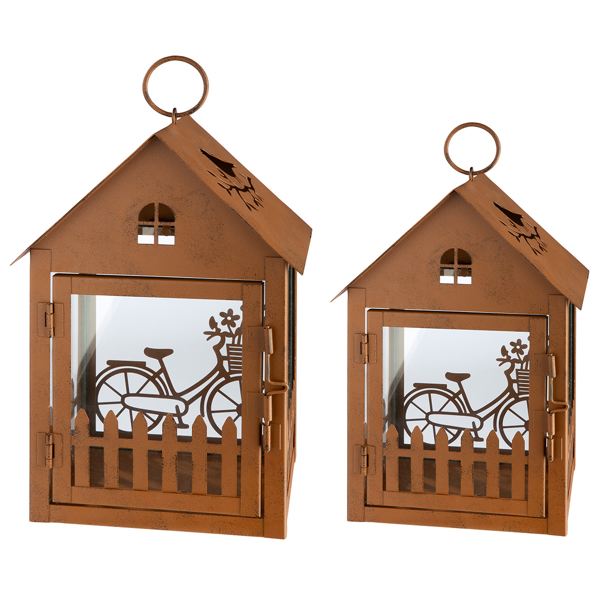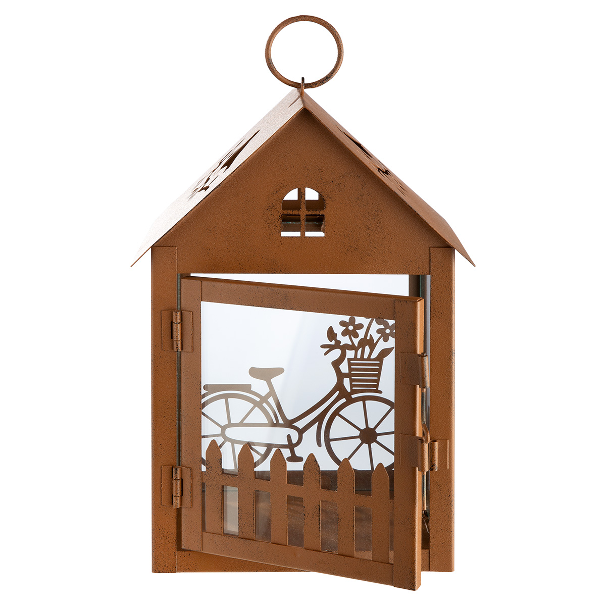 Rustikale Metall-Laterne in Hausform – Rostbraun mit Fahrrad-Motiv (2 Größen erhältlich)
