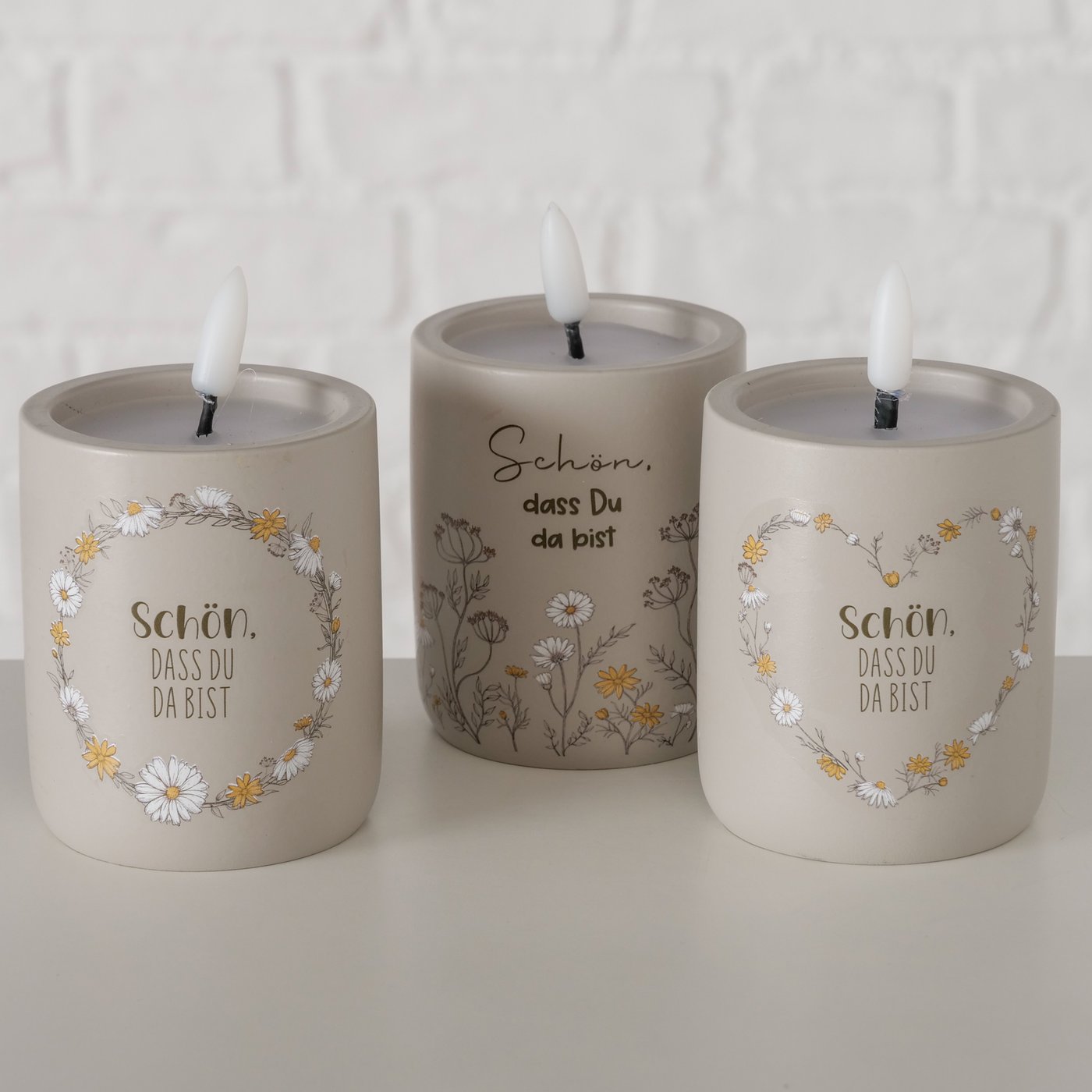 Das dezente Design in Cremeweiß mit gelben Akzenten besticht durch eine matte, bedruckte Oberfläche. Sie haben die Wahl zwischen drei charmanten Varianten, die jeweils mit einem feinen floralen Wiesenmuster und dem herzlichen Spruch „Schön, dass du da bist“ verziert sind. Mit einer Höhe von 10,5 cm und einem Durchmesser von 6,7 cm ist das runde Licht die perfekte Dekoration für Fensterbänke, Esstische oder Kommoden.