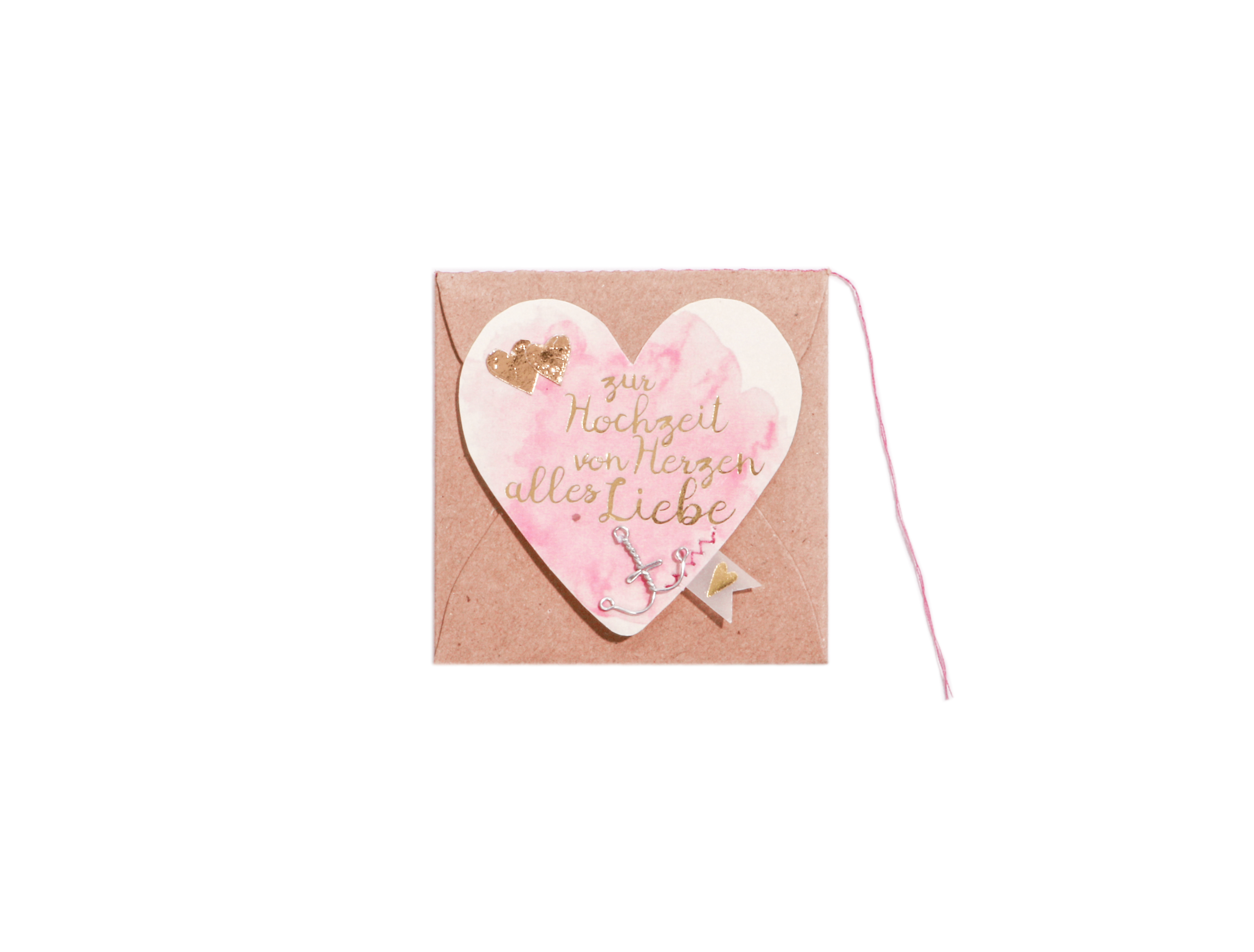 Material: kleine Kärtchen in Herzform mit Applikationen und Umschlag