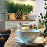 Die organische Form und der feine grüne Rand verleihen der Schale einen authentischen Landhaus-Charakter. Trotz ihrer filigranen Optik ist sie äußerst robust und für den täglichen Gebrauch bestens gewappnet.