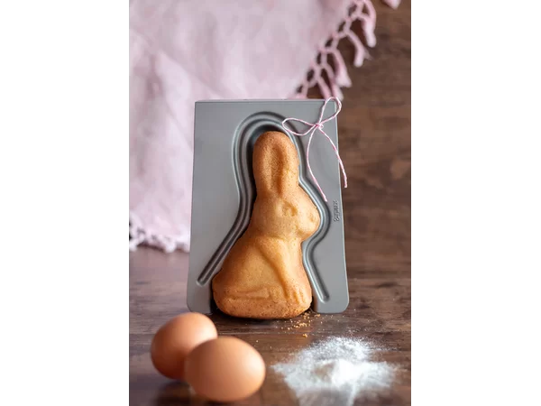 Die Form besteht aus zwei Teilen, die mit praktischen Verschlussklammern fixiert werden, sodass der Hase rundherum perfekt ausgebacken wird und stabil steht. Dank der hochwertigen Antihaftbeschichtung lässt sich der fertige Kuchen mühelos aus der Form lösen, ohne dass feine Details der Hasenfigur verloren gehen. Ob klassischer Rührteig, Schokokuchen oder ein feiner Eierlikörkuchen – dieser kleine Osterhase wird garantiert zum Star des Festes.