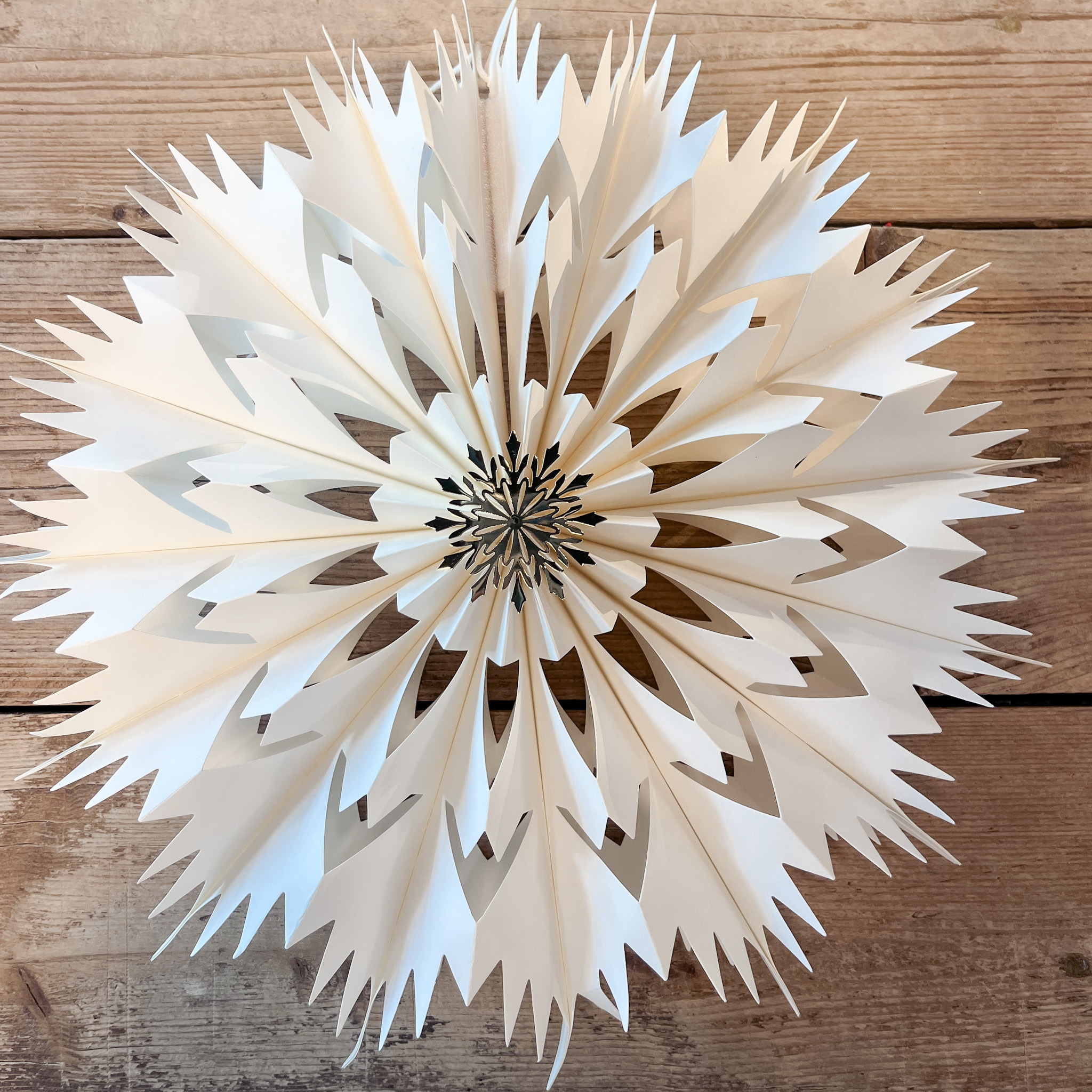 Der Papierstern „Laza“ von Kaheku bringt festliche Eleganz und natürliche Wärme in dein Zuhause. Mit seiner kunstvoll gefalteten Form und den feinen, spitzen Konturen ist er ein echter Blickfang – ob im Fenster, an der Wand oder frei im Raum aufgehängt.