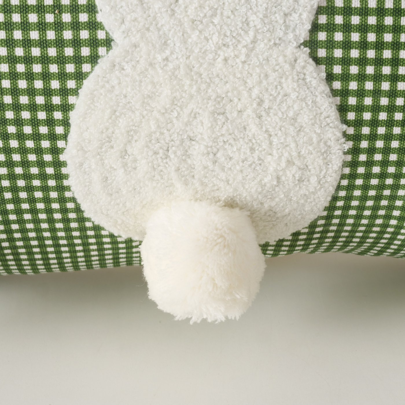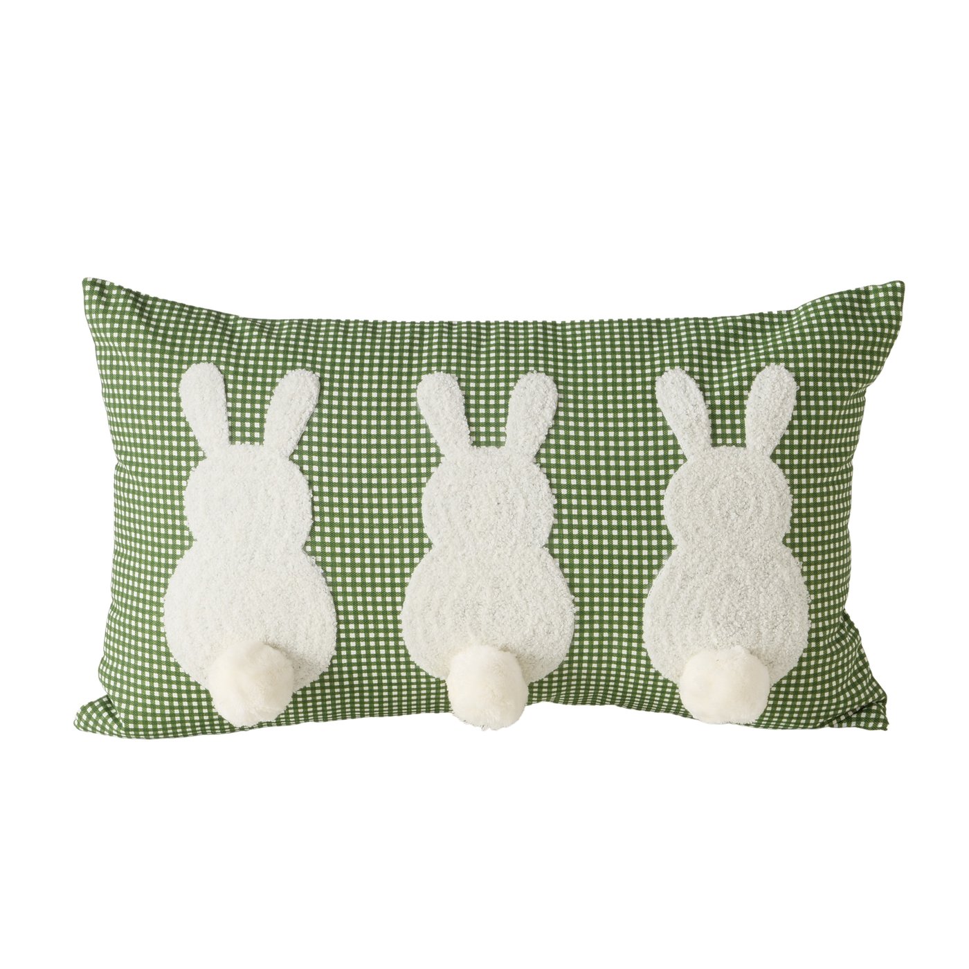 Längliches Kissen mit grünem Karomuster und drei süßen Häschen mit Bommelschwänzchen.