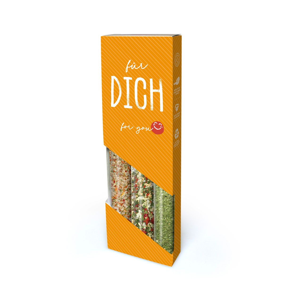 Ein herzliches Geschenk für jeden Anlass: Das 3er Set Gewürze „Für Dich“ von Rinama ist die ideale Wahl, um „Danke“ zu sagen oder einem Lieblingsmenschen eine Freude zu machen. Verpackt in einer fröhlichen, orangefarbenen Geschenkbox, enthält dieses Set drei vielseitige Gewürzmischungen in eleganten Glaszylindern, die in keiner Küche fehlen sollten.
