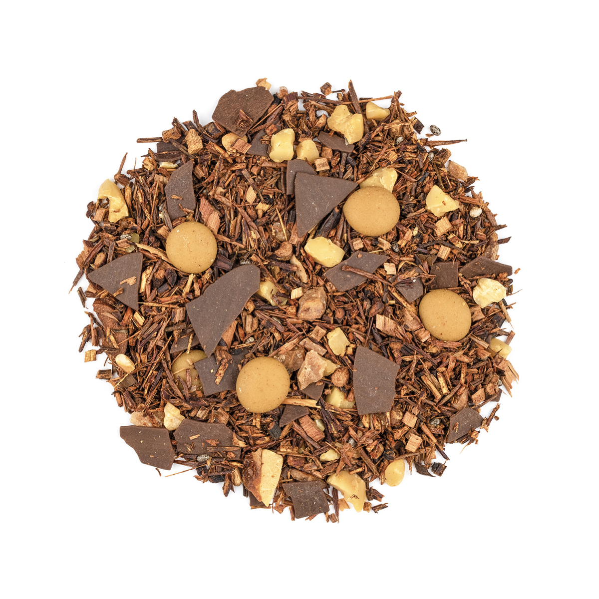 Zutaten: Rotbuschtee, Apfelstücke, Schokostücke (Zucker, Kakaomasse, Kakaobutter, Emulgator: Sojalecithin), Zucker-Konfetti, Aroma, Heidekrautblüten, Kornblumenblüten.