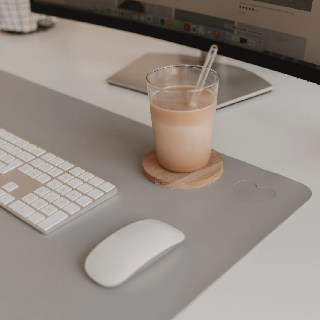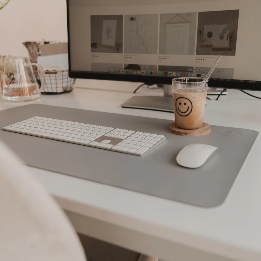 Produktbeschreibung: Verschönern Sie Ihren Arbeitsplatz mit einer Prise Liebe! Die Schreibtischunterlage Herz Grau von Eulenschnitt verbindet Funktionalität mit minimalistischem Design. Das dezente graue Design mit dem ikonischen weißen Herz am rechten Rand sorgt für eine ruhige und inspirierende Atmosphäre an Ihrem Schreibtisch – egal ob im Home Office oder im Büro.