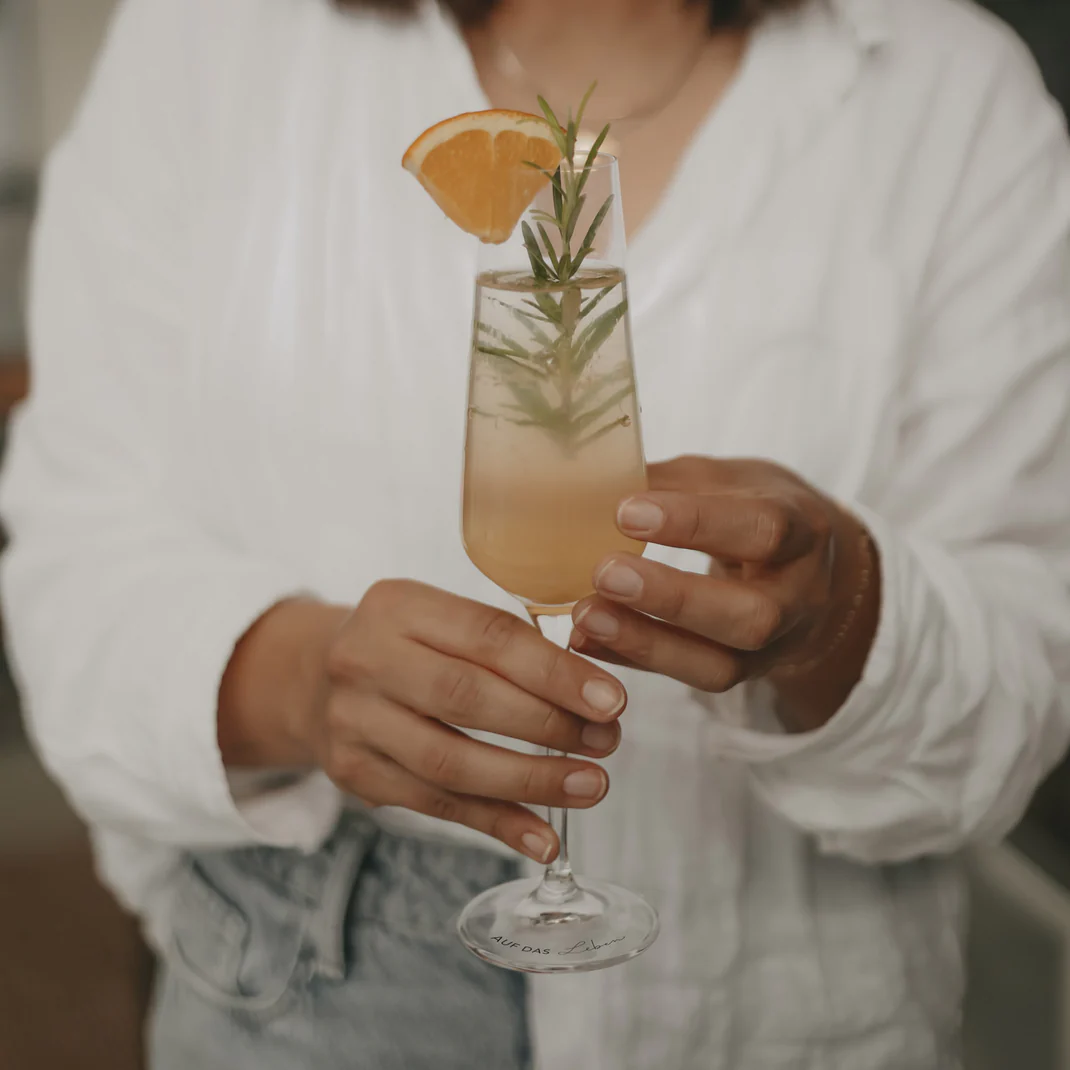 Gefertigt aus hochwertigem Borosilikatglas, besticht das Glas durch seine grazile, dünnwandige Optik und ist dennoch erstaunlich robust und temperaturbeständig. Das Highlight ist der schlichte weiße Schriftzug „Auf das Leben“ am Glasboden, der jedem Schluck eine feierliche Note verleiht. Dank der klaren Linienführung und dem zeitlosen Design passt es harmonisch zu jeder Tischdekoration. Ob Sekt, Champagner oder ein prickelnder Aperitif – in diesem Glas wird jedes Getränk stilvoll präsentiert.