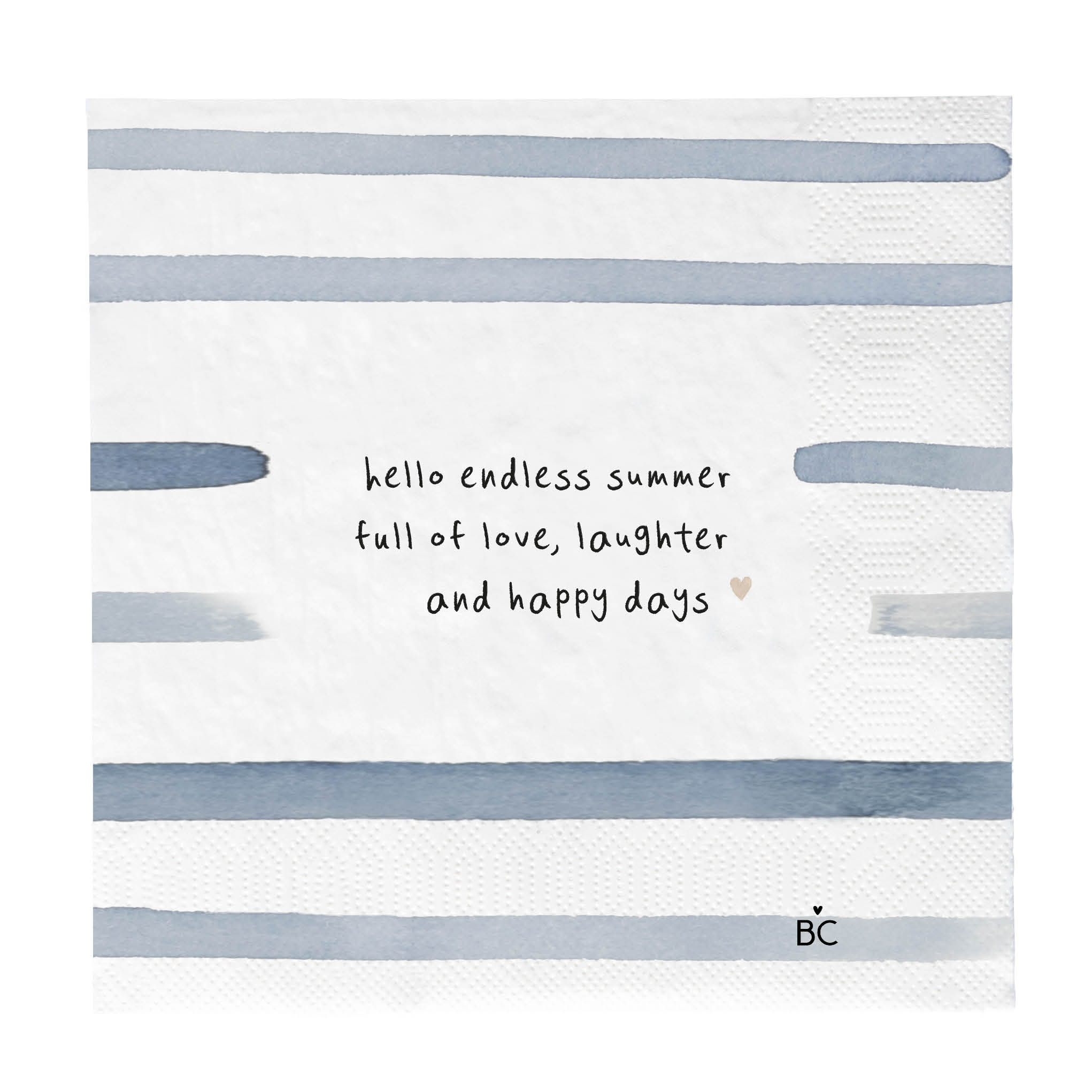 Diese stilvollen Papierservietten „Stripes Summer Blue“ von Bastion Collections bringen sommerliche Leichtigkeit und nordisches Design auf deinen Tisch. Die handgemalten blauen Streifen in Aquarell-Optik kombiniert mit dem liebevollen Schriftzug verleihen jeder Tischdekoration eine frische, entspannte Atmosphäre – perfekt für Sommerfeste, Gartenpartys oder den Alltag.
