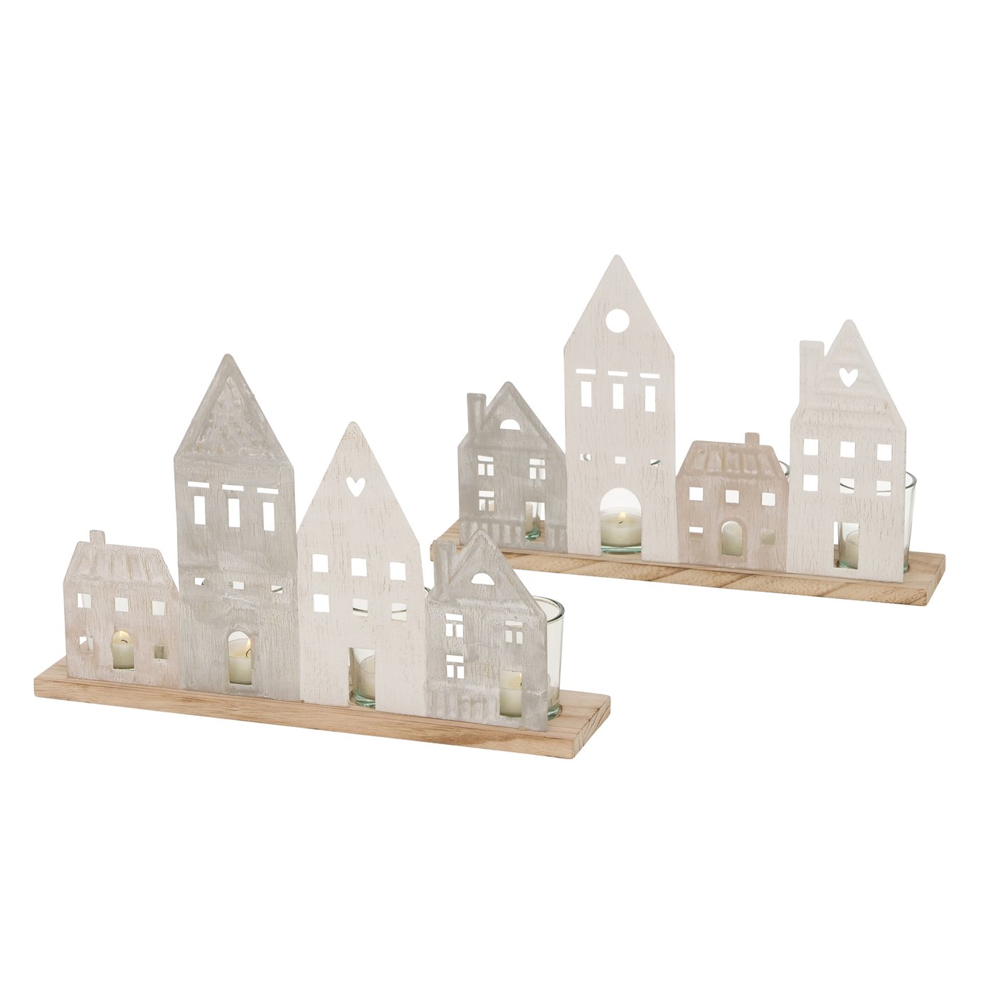 Die dekorative Häuserreihe „Nordy“ von Boltze vereint skandinavische Klarheit mit gemütlicher Lichtstimmung. Die stilisierten Häuser aus Holz und Metall sind mit feinen Cut-Out-Fenstern versehen und werden durch integrierte Teelichtgläser aus Klarglas stimmungsvoll in Szene gesetzt.