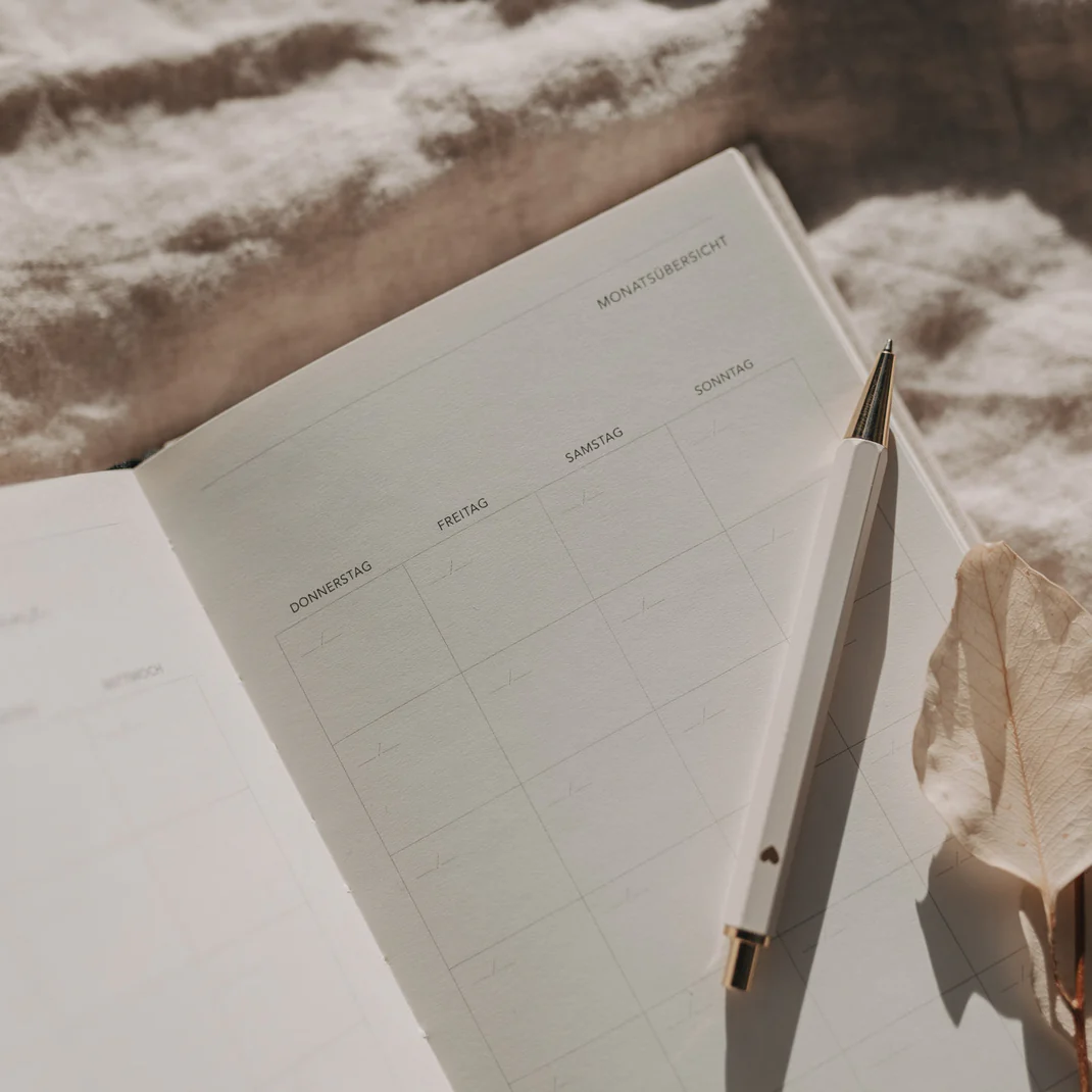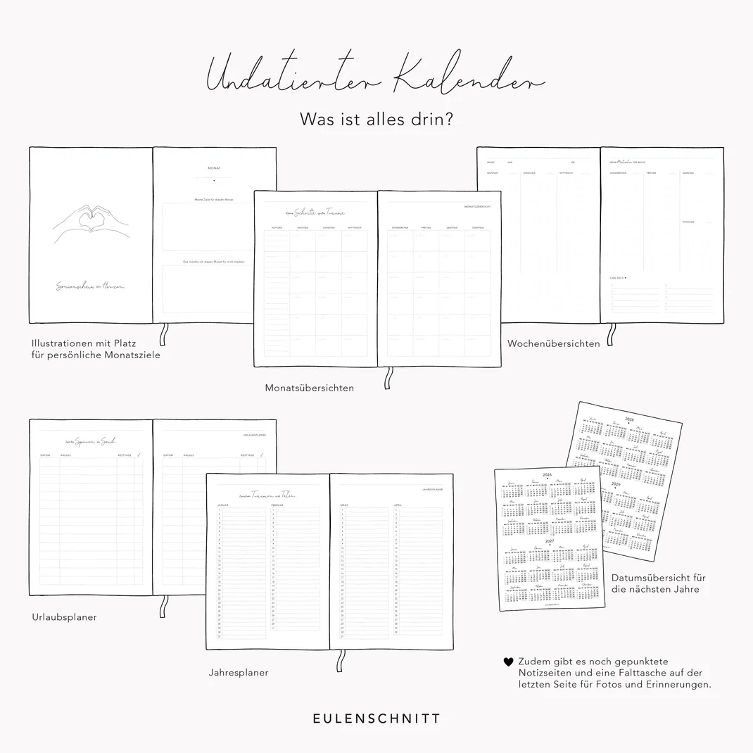 Ausstattung: Wochenübersichten, Monatsübersichten, Platz für Notizen und Lesebänder