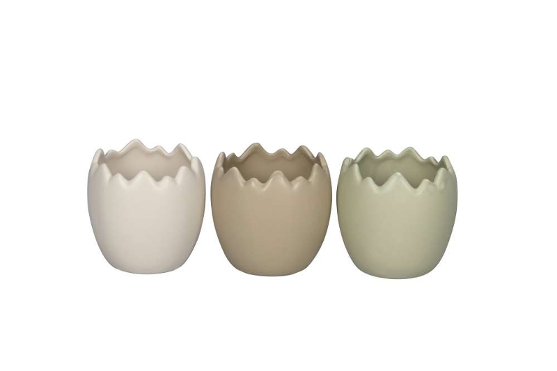 Dekorativer Übertopf aus Keramik in moderner Eiform. Ideal für kleine Pflanzen, Sukkulenten oder als frühlingshafte Tischdekoration. Die sanften Farben lassen sich wunderbar kombinieren und passen perfekt zu natürlicher Wohn- und Osterdekoration.