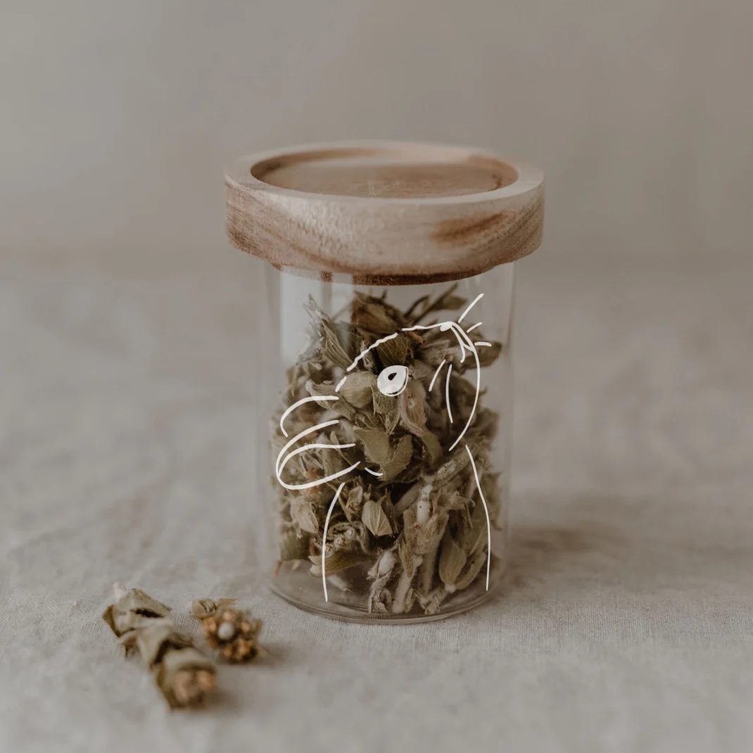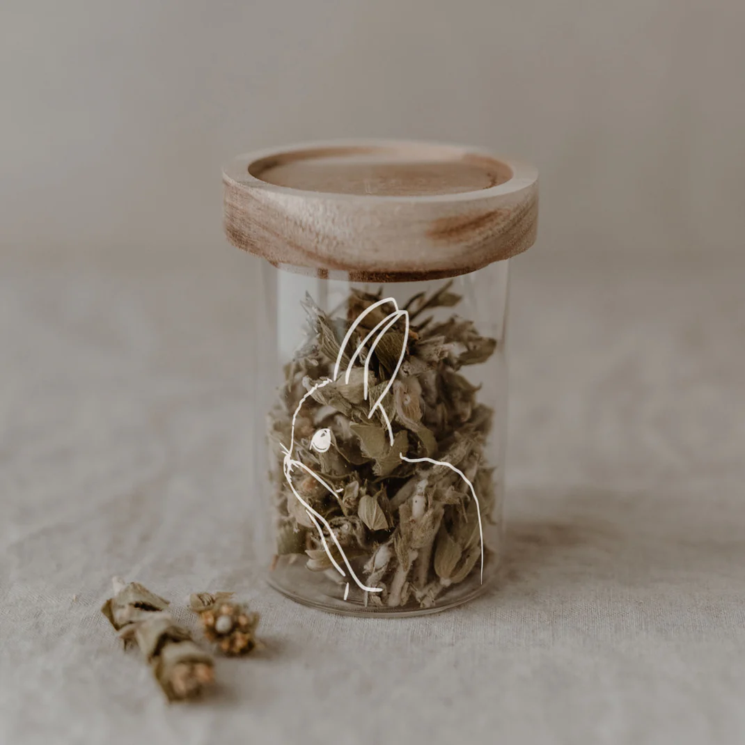 Eulenschnitt Mini Vorratsglas Hase – Kleines Vorratsglas aus Borosilikatglas mit graviertem Akazienholzdeckel (9 cm)