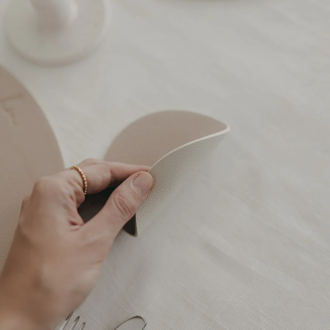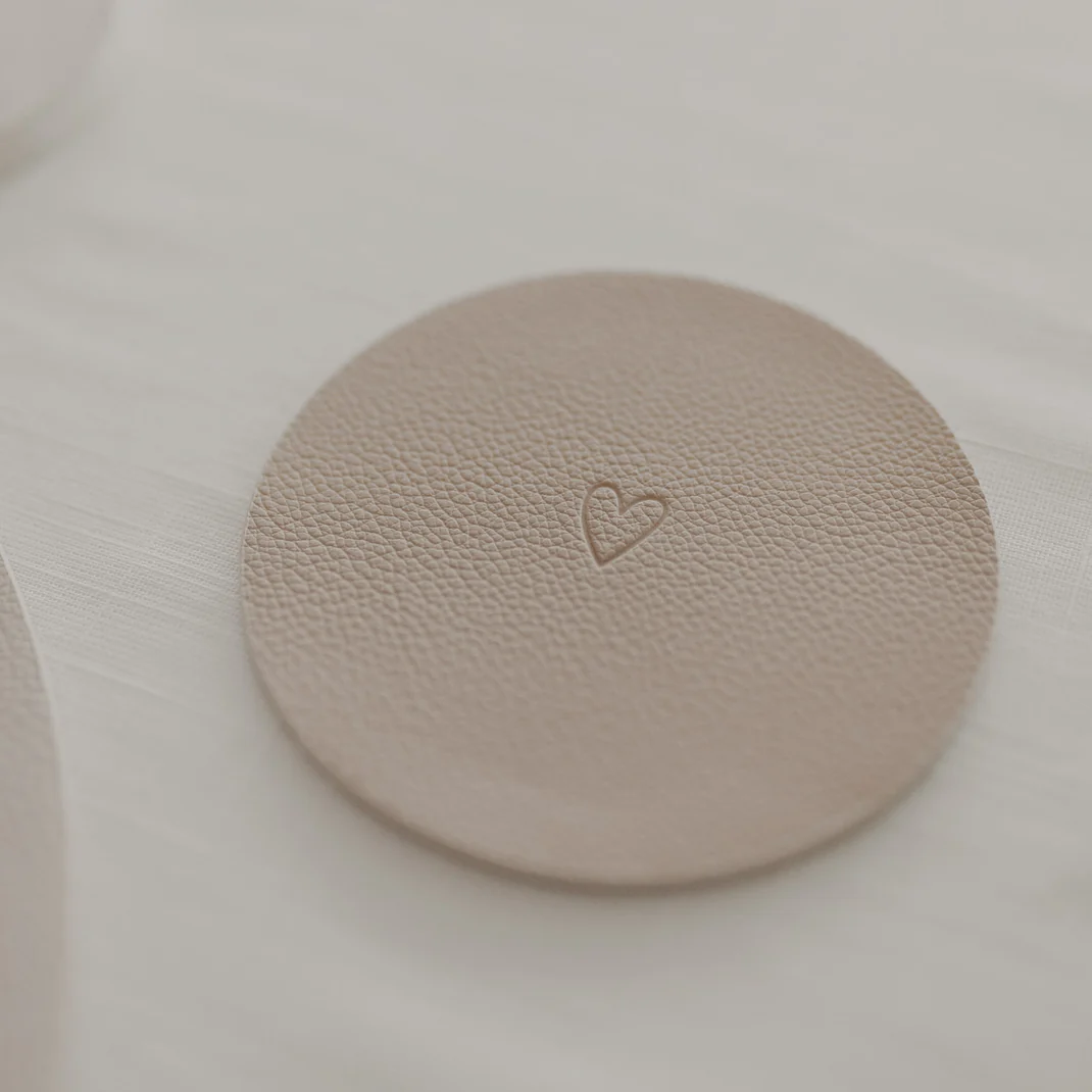 Gefertigt aus hochwertigem PU-Leder, bieten diese Untersetzer zwei verschiedene Farbseiten: ein klassisches Creme und ein warmes Beige. Das Highlight ist die dezente, blindgeprägte Herzform auf der Vorderseite, die jedem Getränk – von der morgendlichen Kaffeetasse bis zum abendlichen Weinglas – einen liebevollen Rahmen gibt. Die Untersetzer sind rutschfest, extrem langlebig und schützen Ihre Oberflächen zuverlässig vor unschönen Rändern oder Kratzern. Nach dem Gebrauch lassen sie sich ganz unkompliziert mit einem feuchten Tuch reinigen.