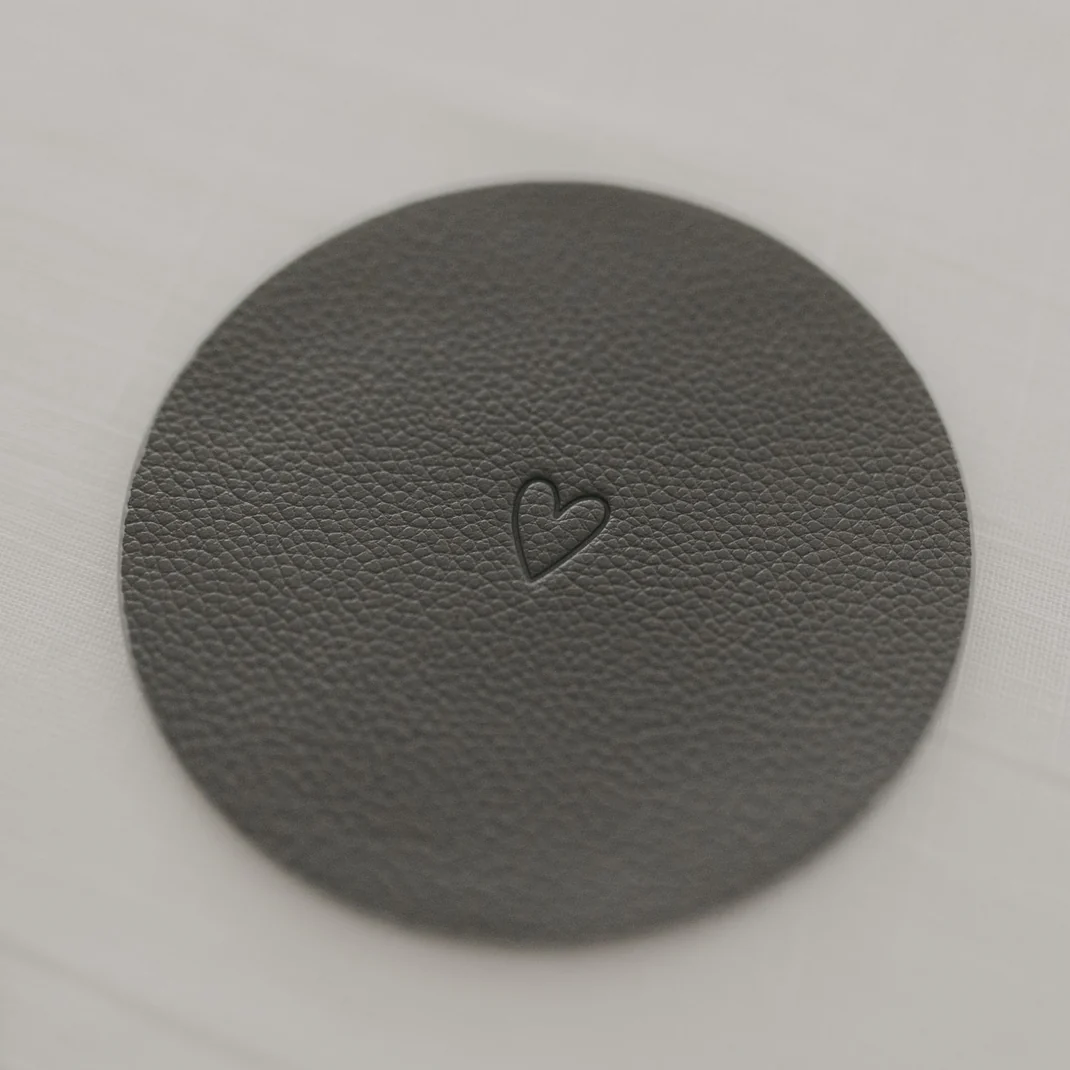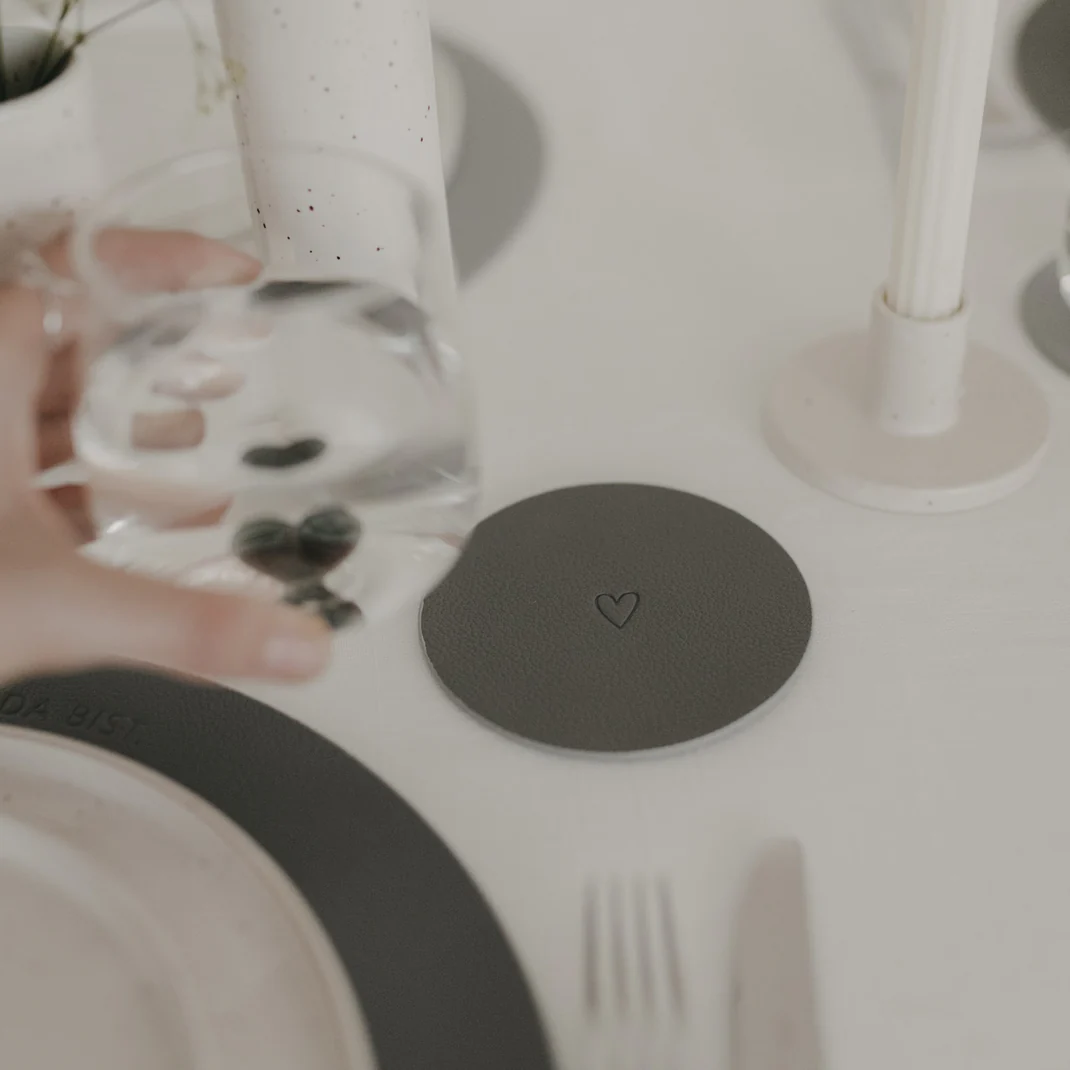 Gefertigt aus hochwertigem und strapazierfähigem PU-Leder, überzeugen diese Untersetzer durch ihre Vielseitigkeit. Dank der Wendefunktion können Sie je nach Tischdeko zwischen einem helleren Grau und einem tieferen Anthrazit wählen. Das Highlight ist die feine Blindprägung in Herzform auf der Vorderseite, die sowohl bei der Kaffeetasse am Morgen als auch beim Weinglas am Abend für einen charmanten Blickfang sorgt. Die Untersetzer sind rutschfest, wasserabweisend und schützen empfindliche Oberflächen zuverlässig vor Kratzern und Flecken. Nach der Benutzung lassen sie sich ganz einfach mit einem feuchten Tuch abwischen.
