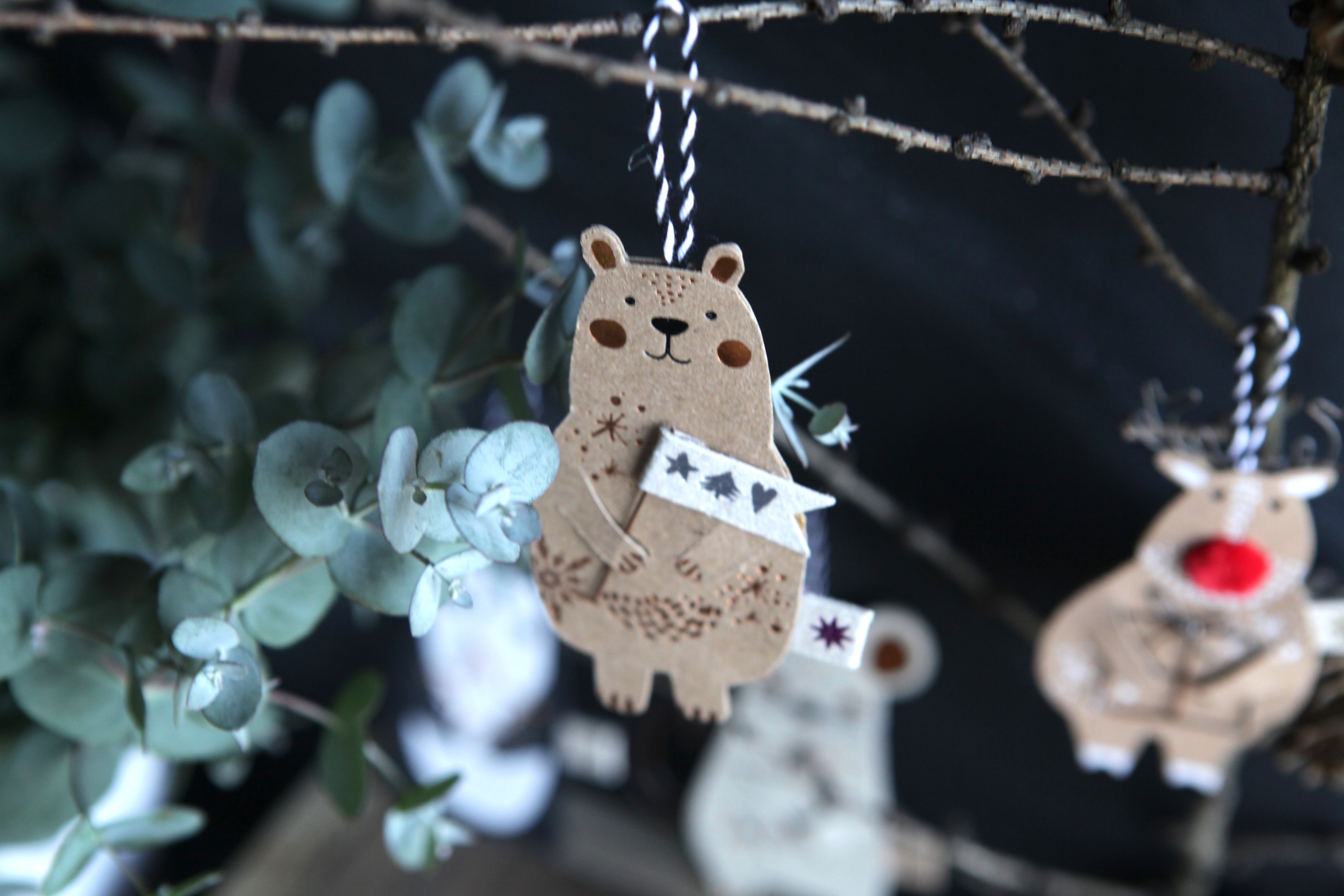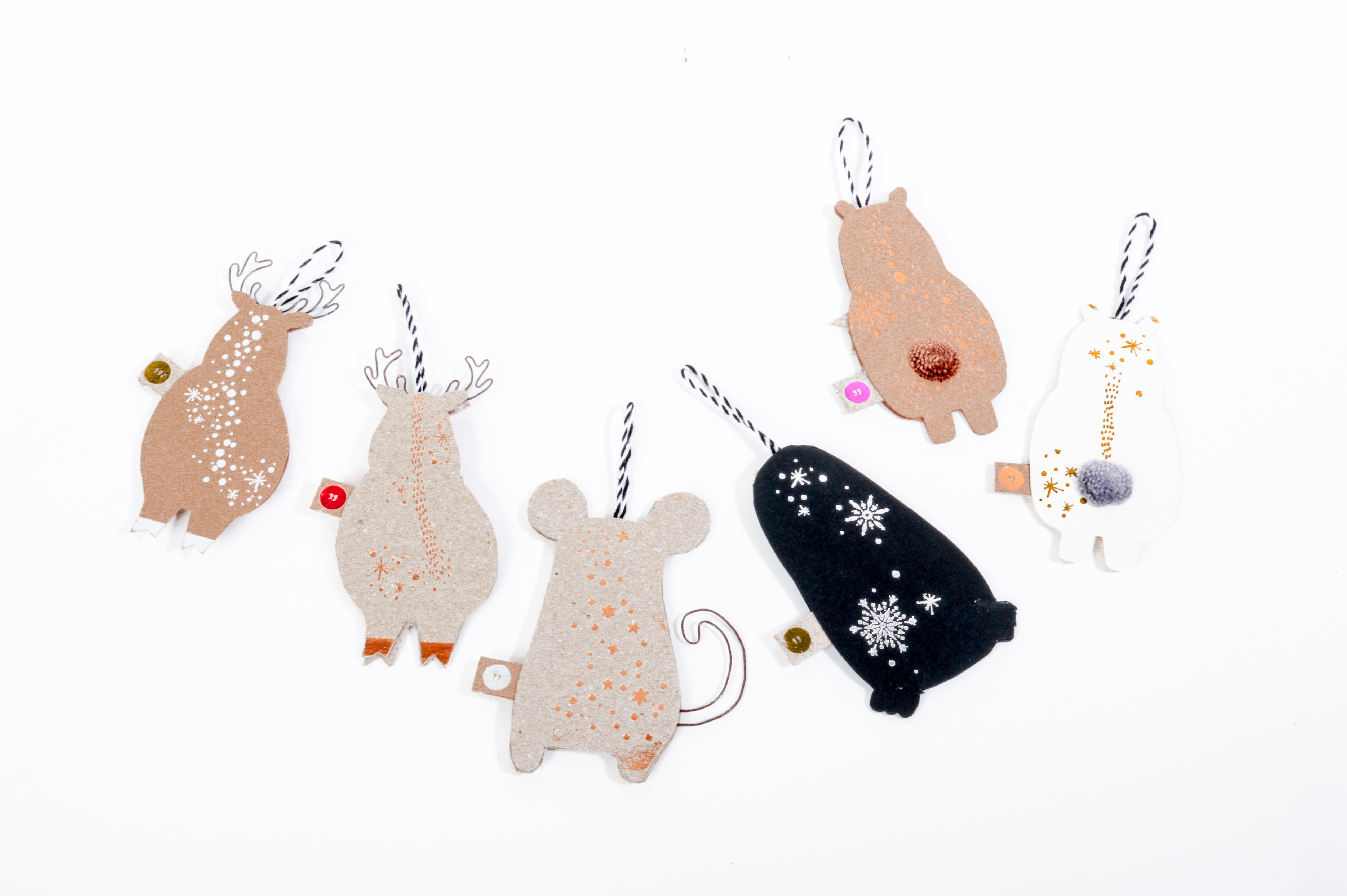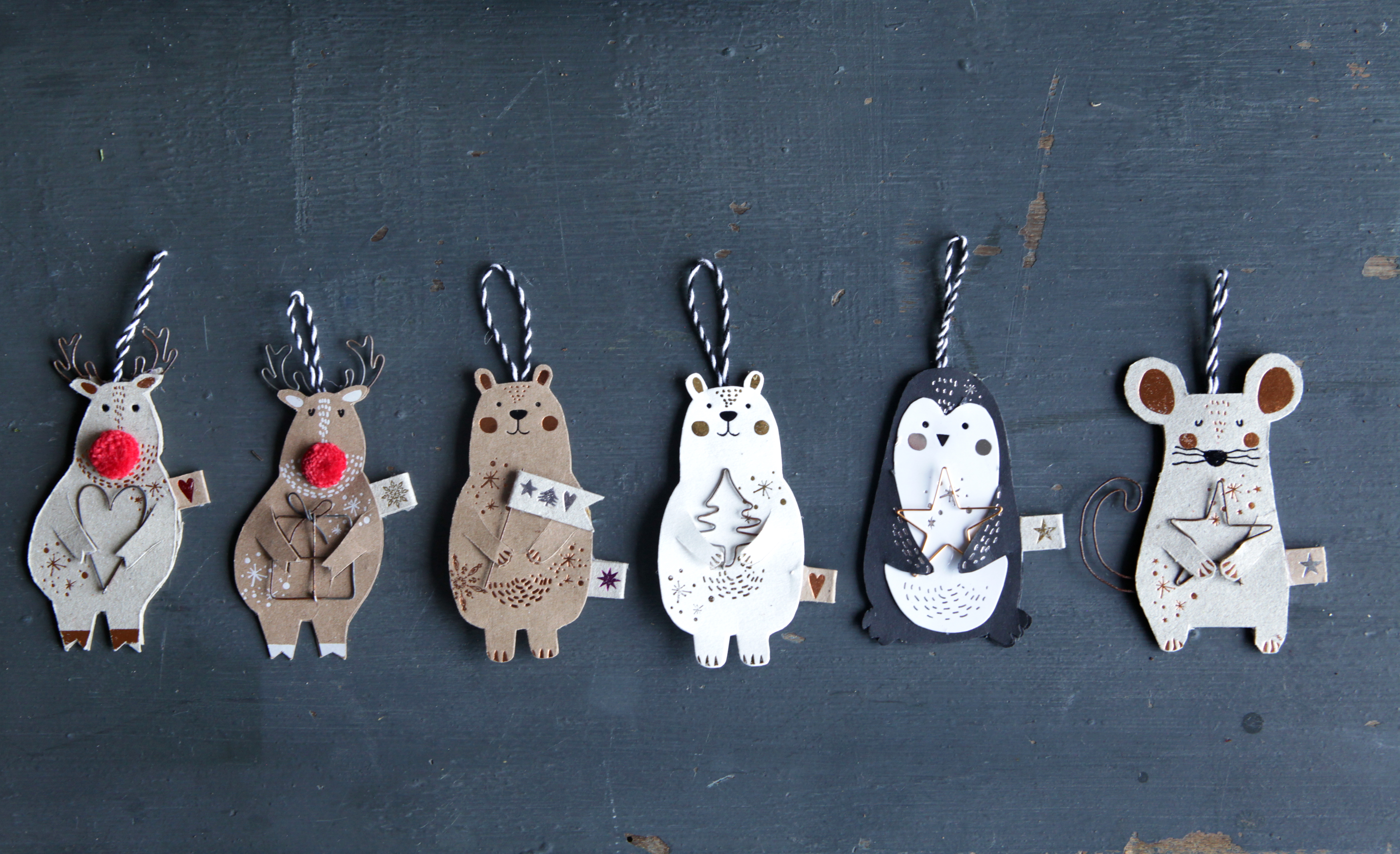 Material: Ornamente aus Pappe mit Heißsiegelung, Draht und Applikationen