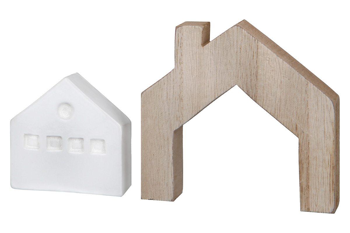 Bring a sense of "home" to your decor! This elegant house-shaped decorative stand stands out with its minimalist design and premium material blend. A natural wooden frame protectively surrounds a smaller, glossy white resin house, complete with delicate window details and a heart accent on the larger version.