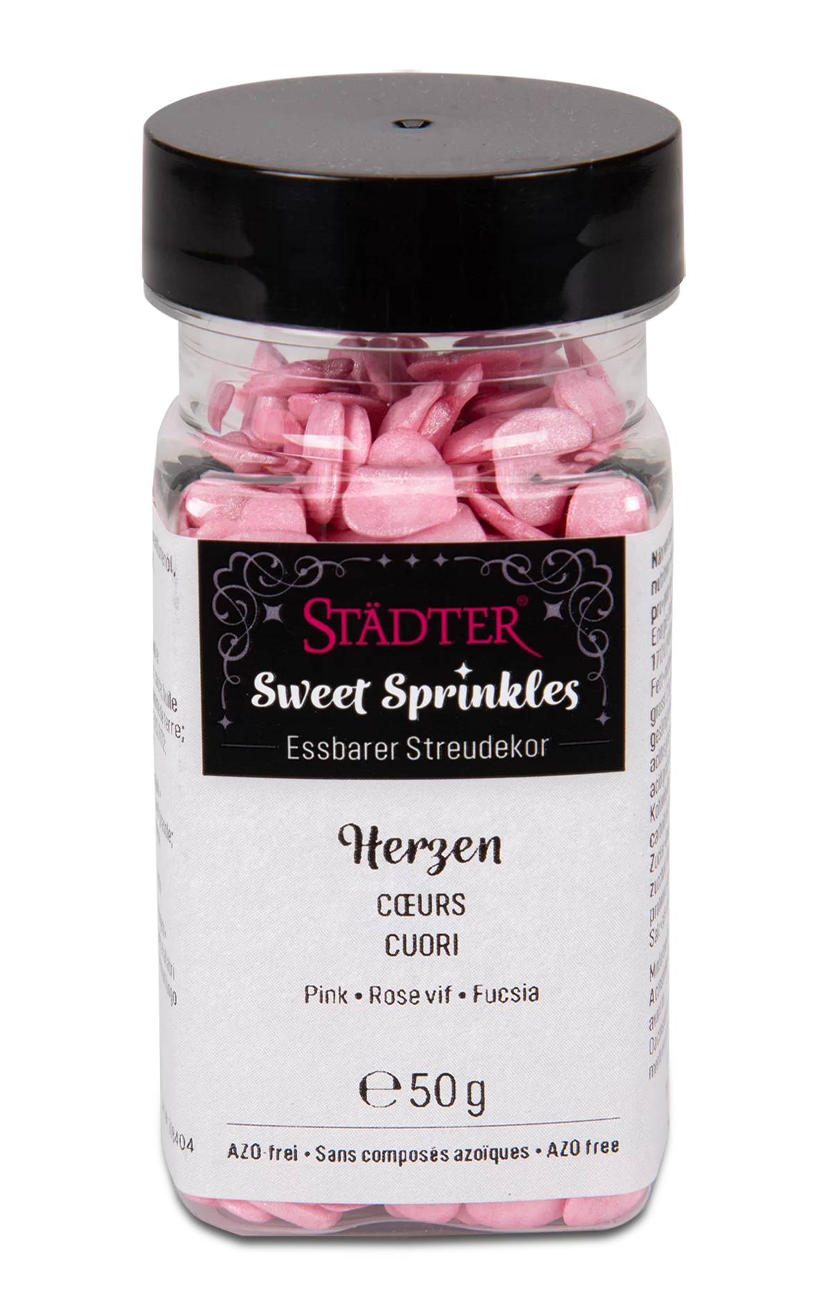 The sprinkles impress with their bold color and sweet taste. Thanks to the practical shaker jar, the hearts are easy to dispense—whether you want a full coat of hearts or just a few targeted highlights on a swirl of frosting. Create brilliant accents on glazes, chocolate coatings, or whipped cream and turn every dessert into a small work of art.