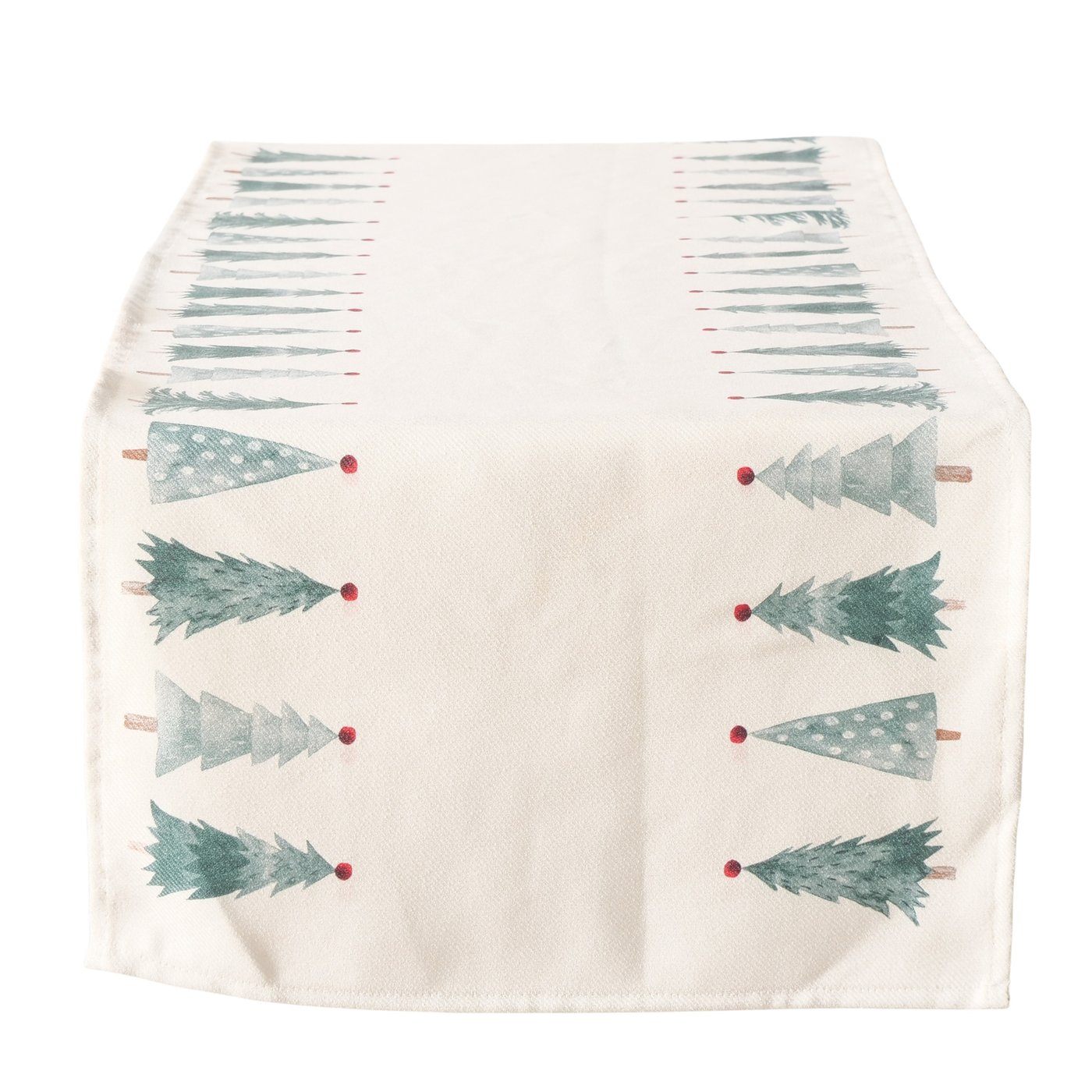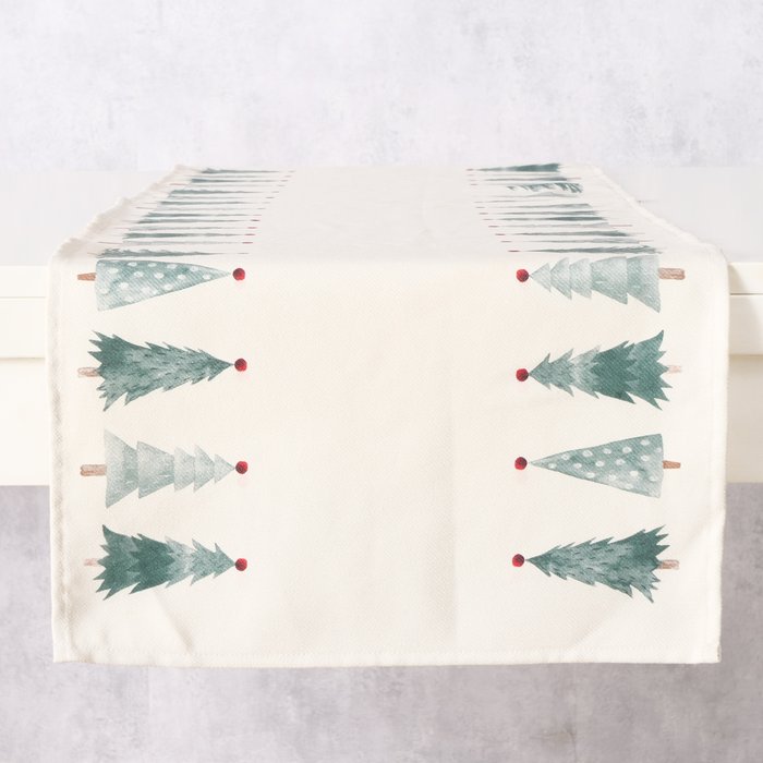 The Carol table runner brings a playful yet modern touch to any winter or holiday table setting. Its design features stylized Christmas trees in soft green tones arranged along the edges, creating a calm, Nordic-inspired look.